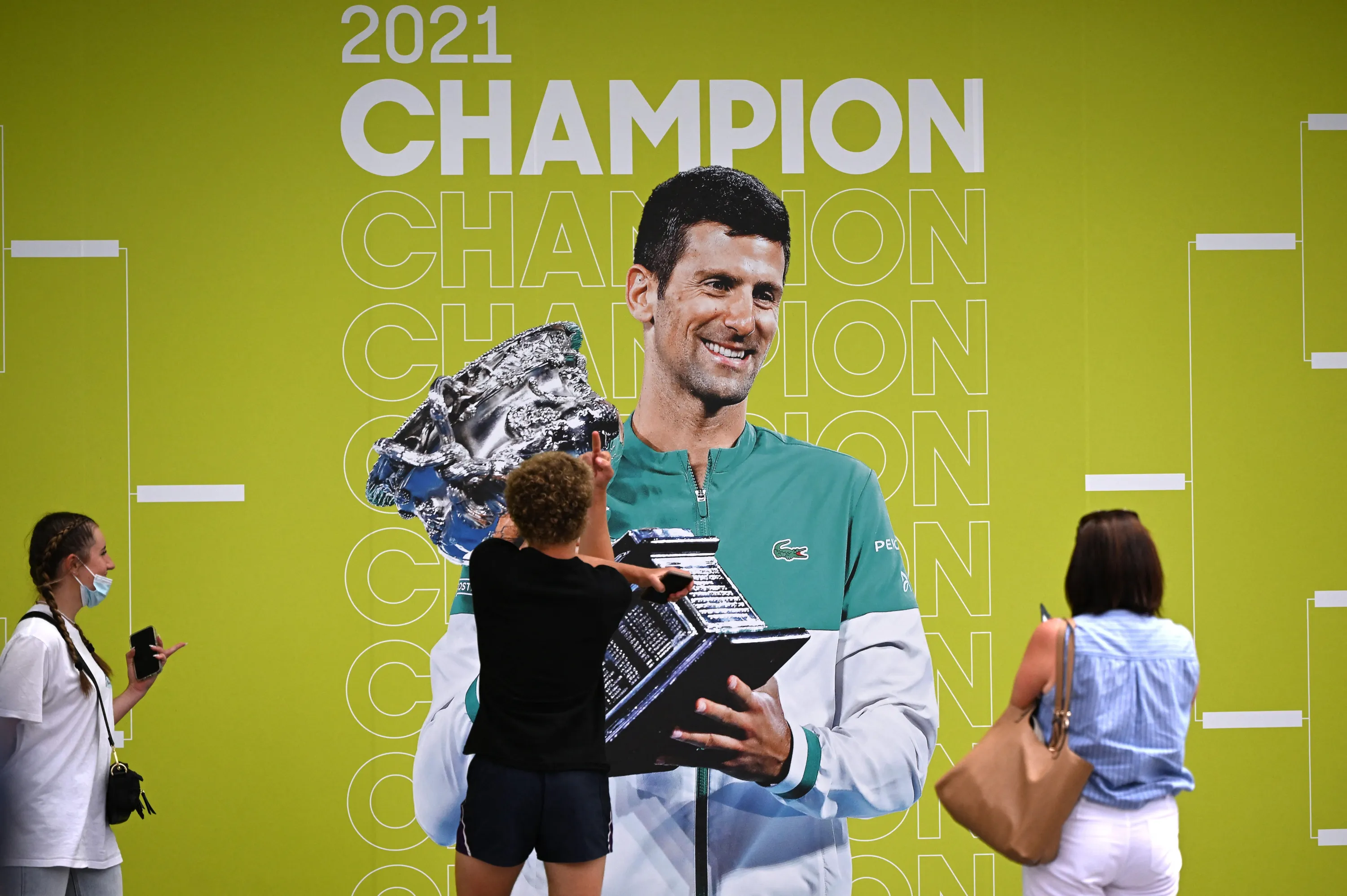 A fan gestures in front of a picture of Novak Djokovic on the first day of the Australian Open at Melbourne Park in Australia, January 17, 2022. (Photo by James Gourley/Reuters)