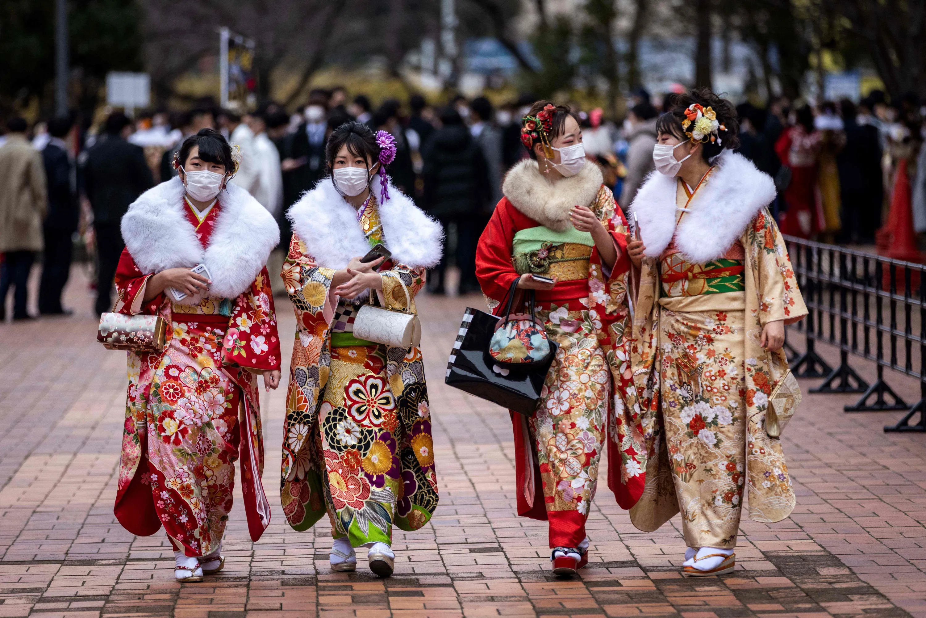 Twenty-year-old women dressed in kimonos arrive at Todoroki Arena to attend a celebration ceremony to mark “Coming-of-Age Day” to honour people who turn 20 this year to signify adulthood, in Kawasaki, Kanagawa prefecture on January 10, 2022. (Photo by Behrouz Mehri/AFP Photo)