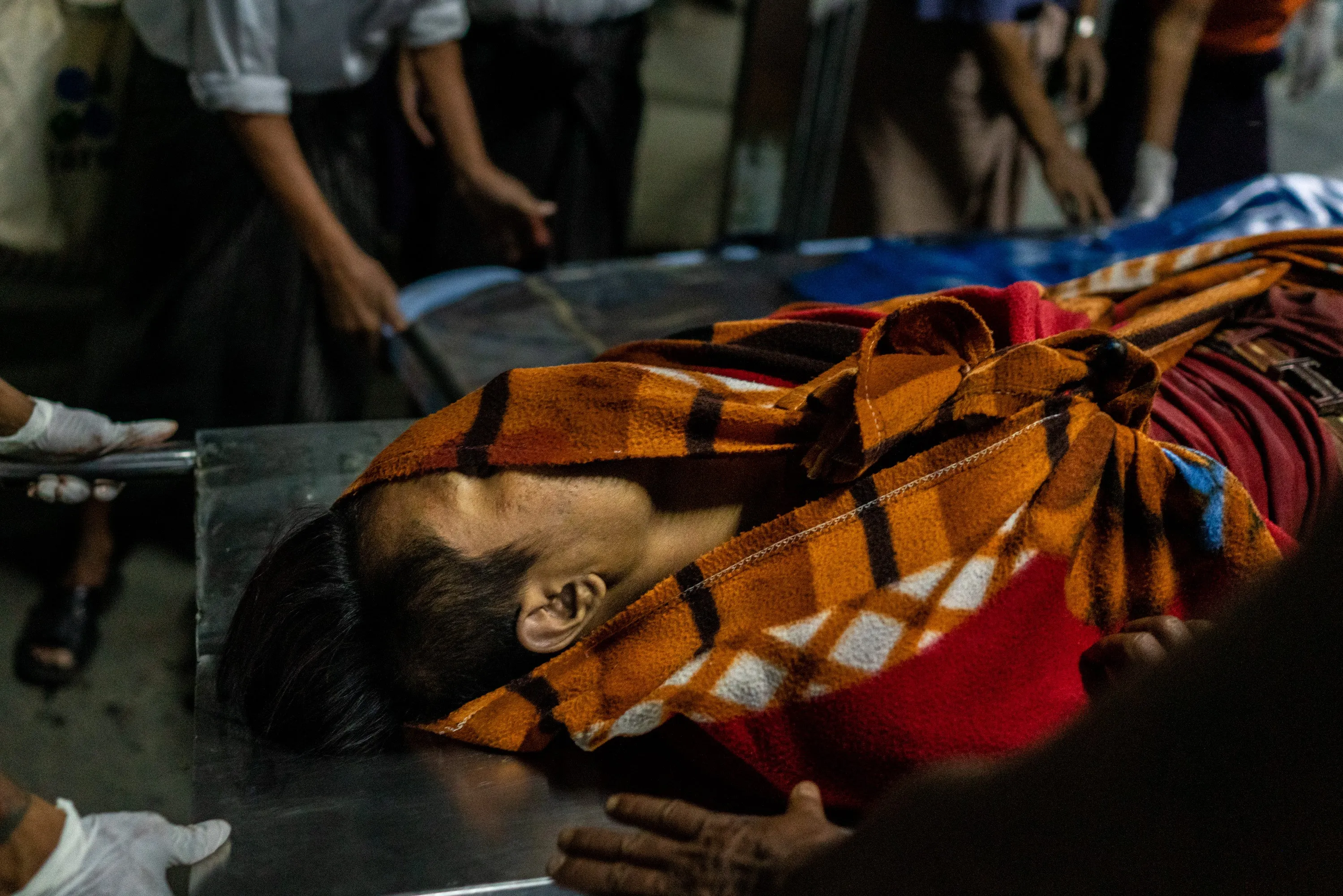 Medics wrap the body of a protester who was killed in clashes with cloth on March 03, 2021 in Yangon, Myanmar. Medics and health workers have found themselves on the front lines and under intense pressure, as they try to help anti-coup protesters as resistance continues to erupt across the country, to be met with deadly force by the military junta. The military government has intensified a crackdown on protesters in recent days, using tear gas and live ammunition, charging at and arresting protesters and journalists. At least 25 people have been killed so far, according to monitoring organizations, leaving ill-equipped medics to help scores of the injured. (Photo by Stringer/Getty Images)