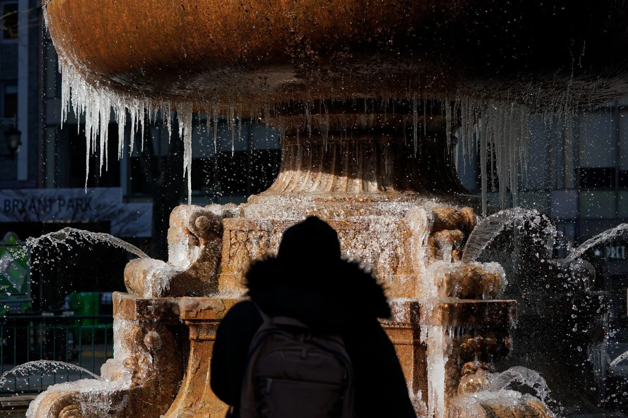 A pedestrian looks at a partially frozen fountain in New York, Tuesday, January 11, 2022. A mass of arctic air swept into the Northeast on Tuesday, bringing bone-chilling sub-zero temperatures and closing schools across the region for the second time in less than a week. (Photo by Seth Wenig/AP Photo)