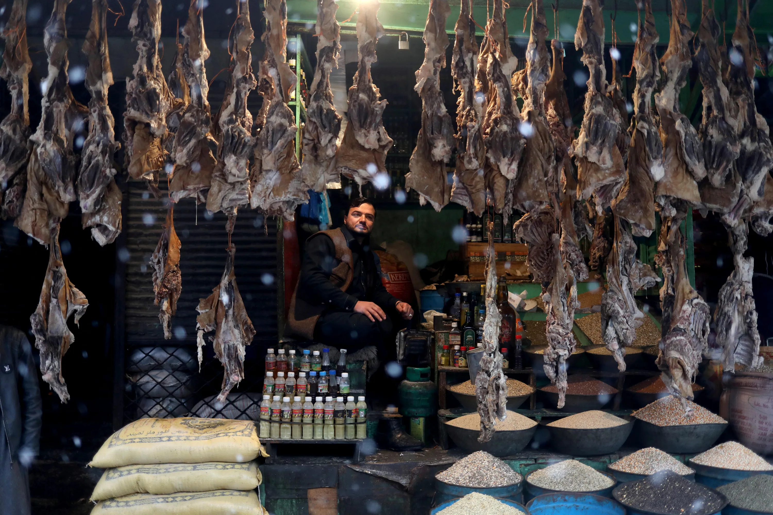 A shopkeeper waits for customers during a snowfall in Kabul, Afghanistan, January 3, 2022. (Photo by Ali Khara/Reuters)
