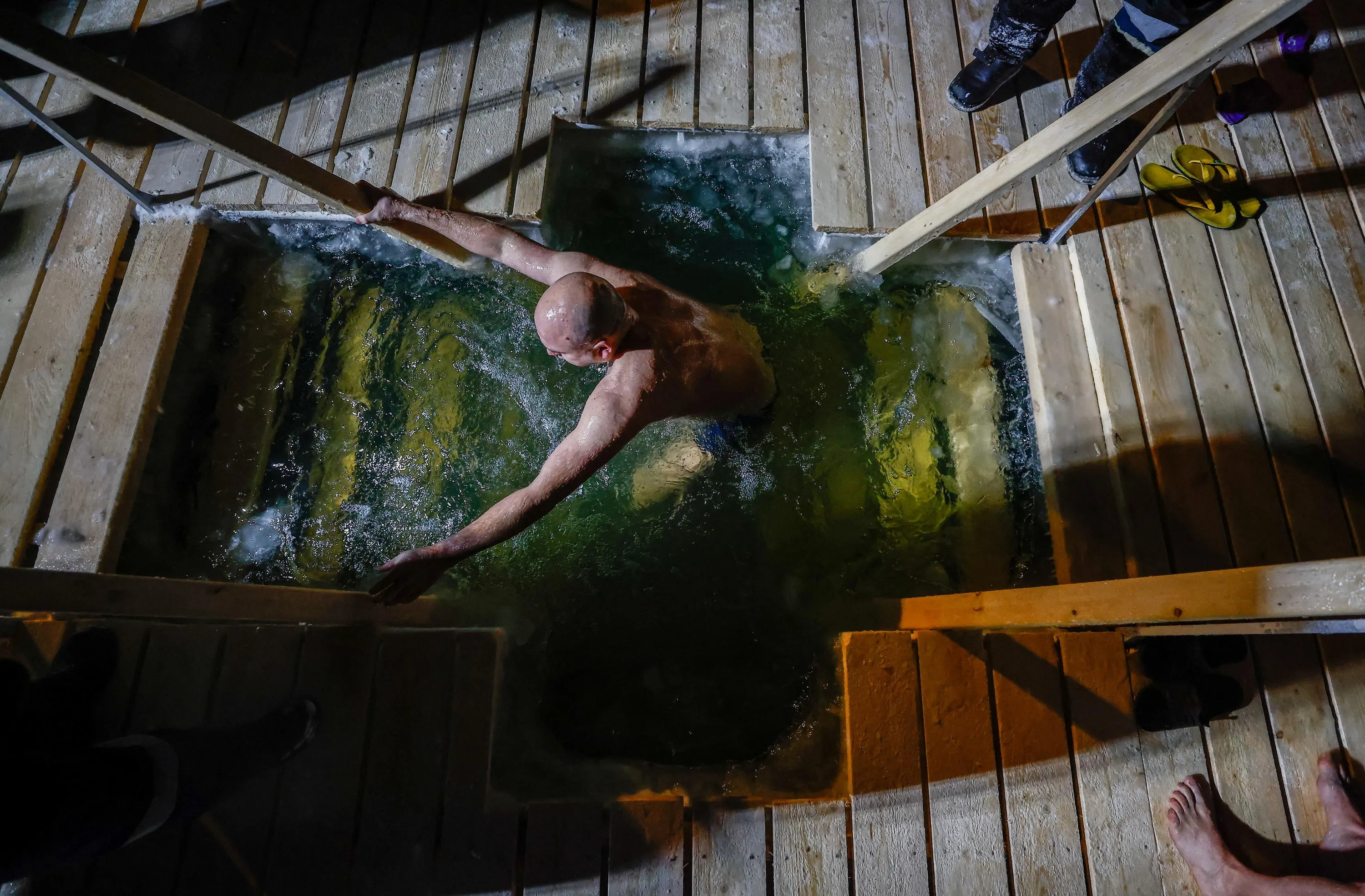 A man takes a dip in icy waters during celebrations of the Orthodox Christian feast of Epiphany in Pereslavl-Zalessky, Yaroslavl region, Russia on January 19, 2022. (Photo by Maxim Shemetov/Reuters)