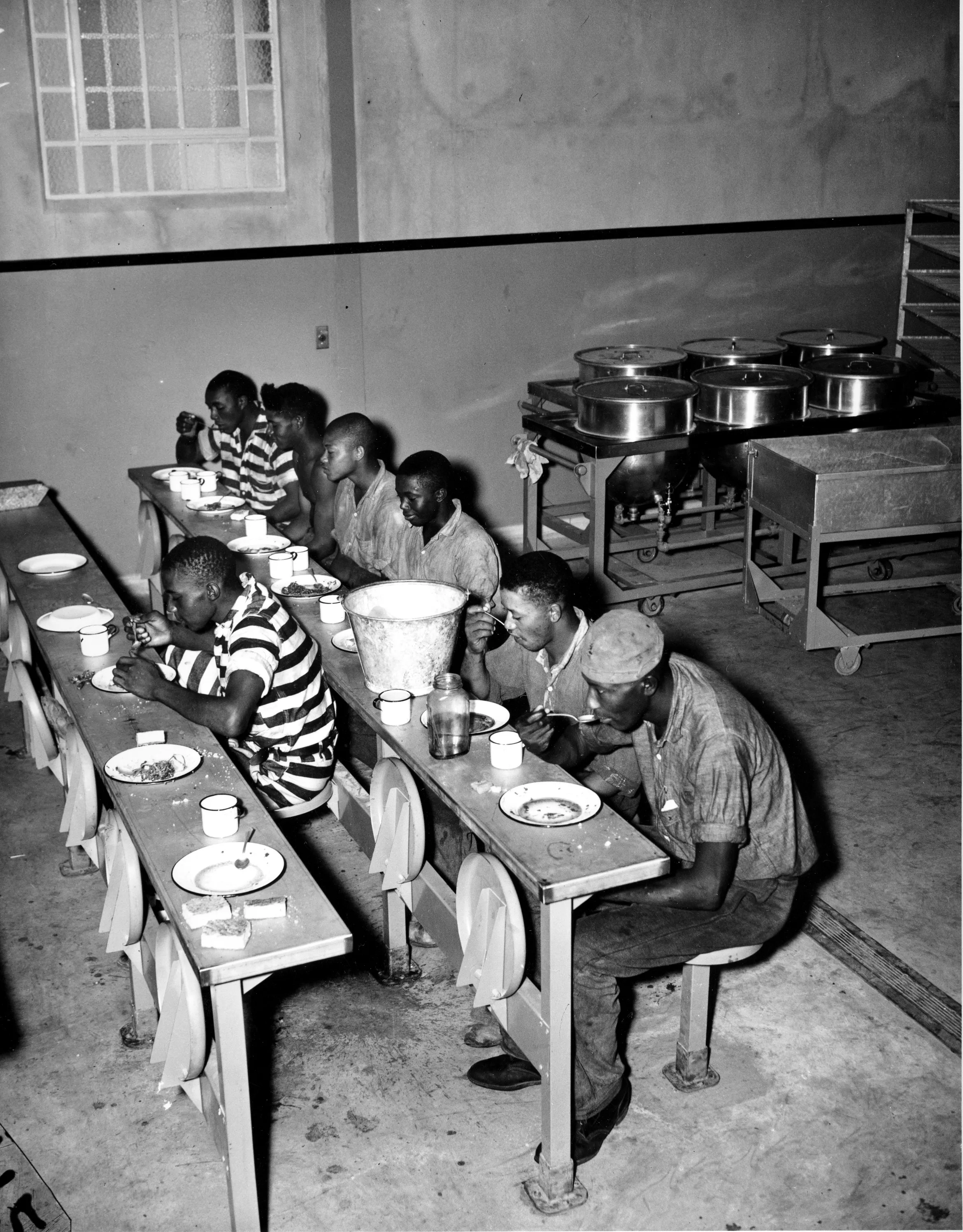 Inmates take a break to eat at the Georgia State Prison's new location near Reidsville, Tattnall County, on September 6, 1937. (Photo by AP Photo)