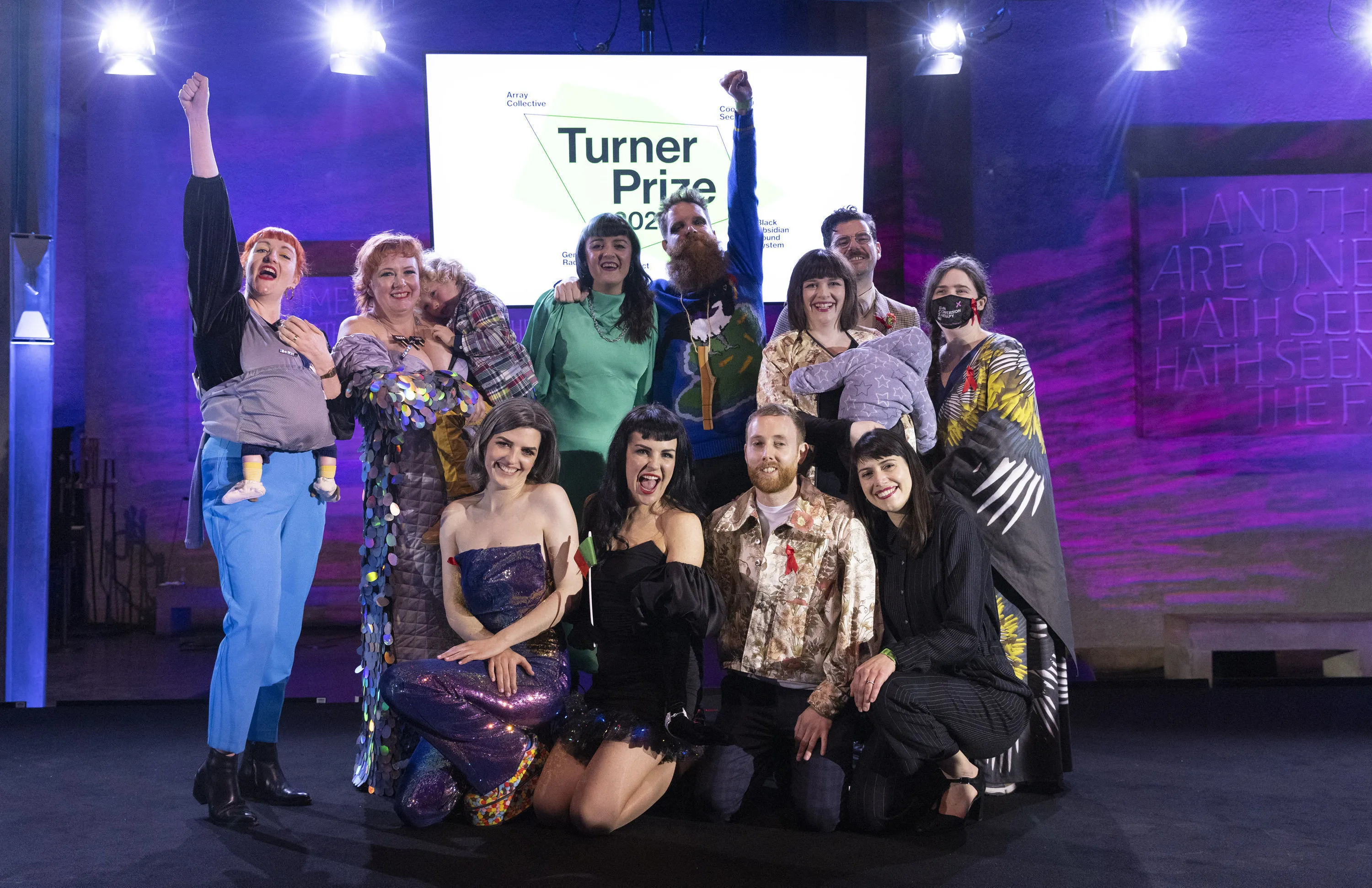 Array Collective are announced as the winner of the Turner Prize 2021, the leading international award for contemporary art, at Coventry Cathedral, Coventry, England, Wednesday December 1, 2021. An 11-person collective from Belfast that aims to transcend Northern Ireland’s political and religious divides has won the U.K.’s prestigious Turner Prize for art. The Array Collective took the 25,000 pound ($33,000) prize on Wednesday for “The Druithaib’s Ball”, a recreation of a traditional Irish shebeen, or speakeasy full of references to 100 years of Northern Ireland history. (Photo by Matt Alexander/PA Wire via AP Photo)