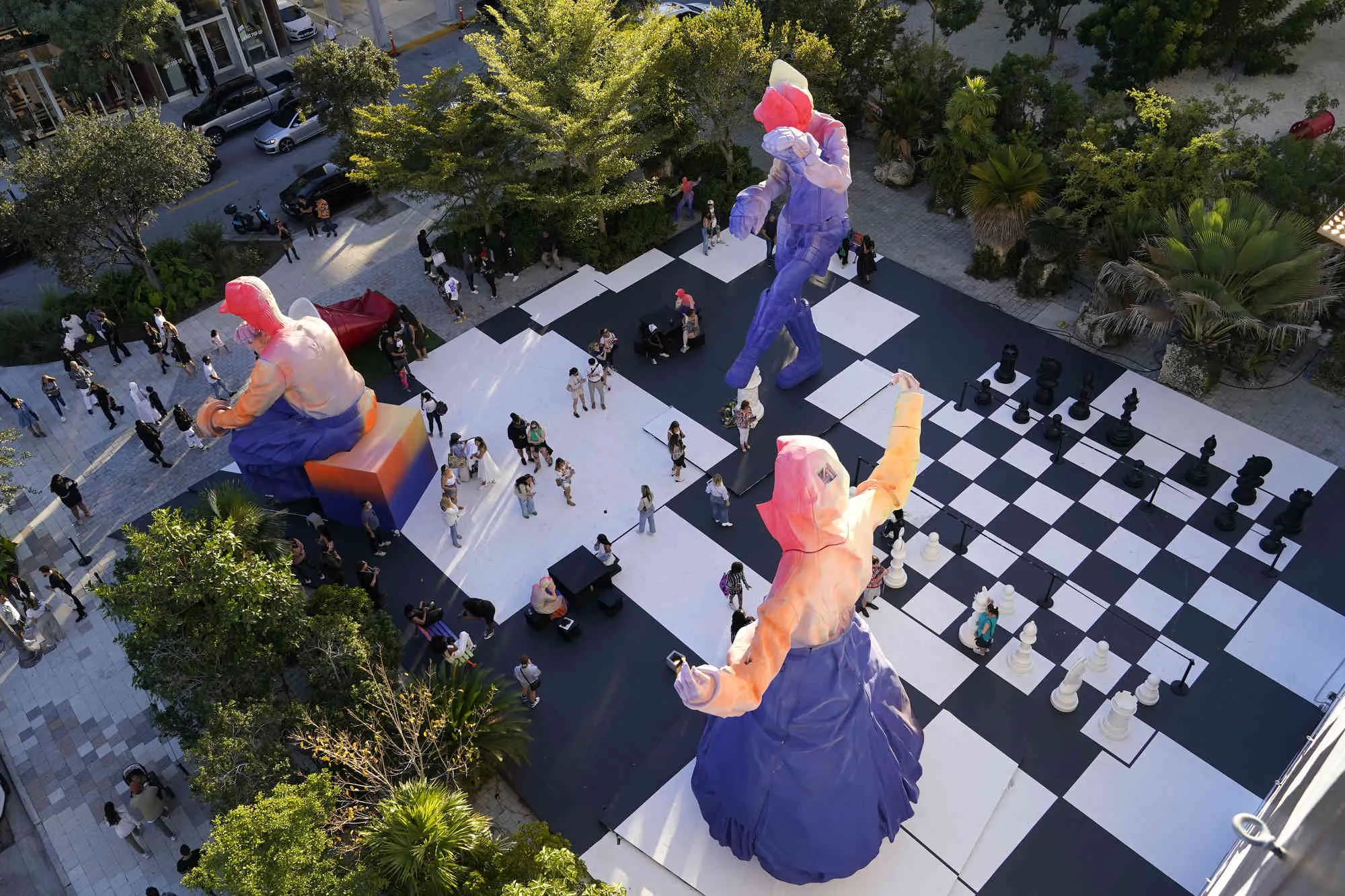 Sculptures and a giant chess set decorate a plaza as part of a Louis Vuitton art installation during Miami Art Week, Friday, December 3, 2021, in the Design District neighborhood of Miami. The project was done under late designer Virgil Abloh who died Sunday at age 41 after a lengthy battle with cancer. Art Week is an annual event centered around the Art Basel Miami Beach fair. (Photo by Lynne Sladky)/AP Photo