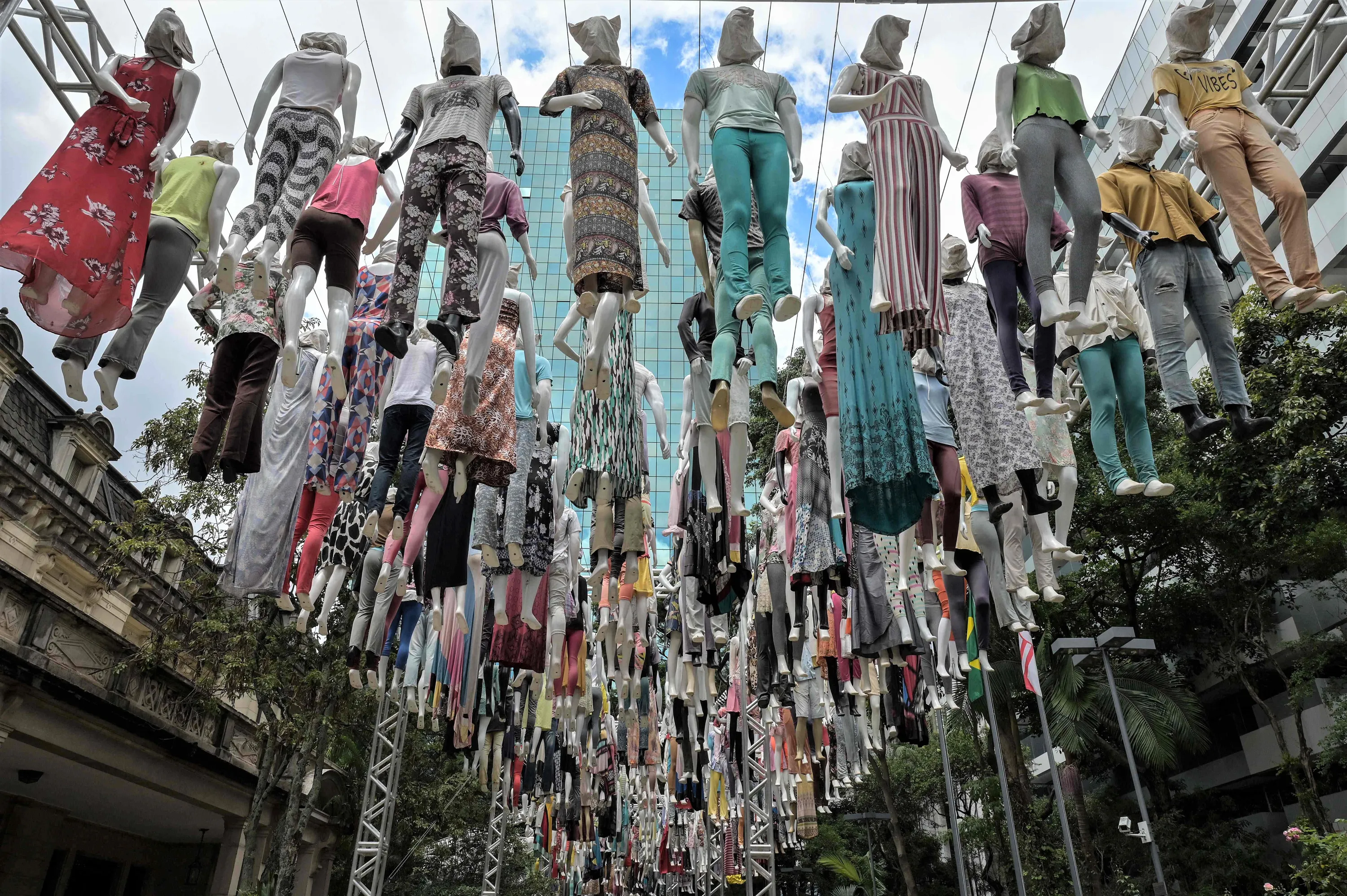 View of Renascimento (Rebirth), an installation by Brazilian artist Siron Franco, at Casa das Rosas cultural center, in Sao Paulo, Brazil, on January, 13, 2022. Renascimento is an installation formed by 365 mannequins suspended by wires, which pays tribute to the victims of the pandemic of COVID-19, to health professionals and at the same time celebrates life, according to the artist. (Photo by Nelson Almeida/AFP Photo)
