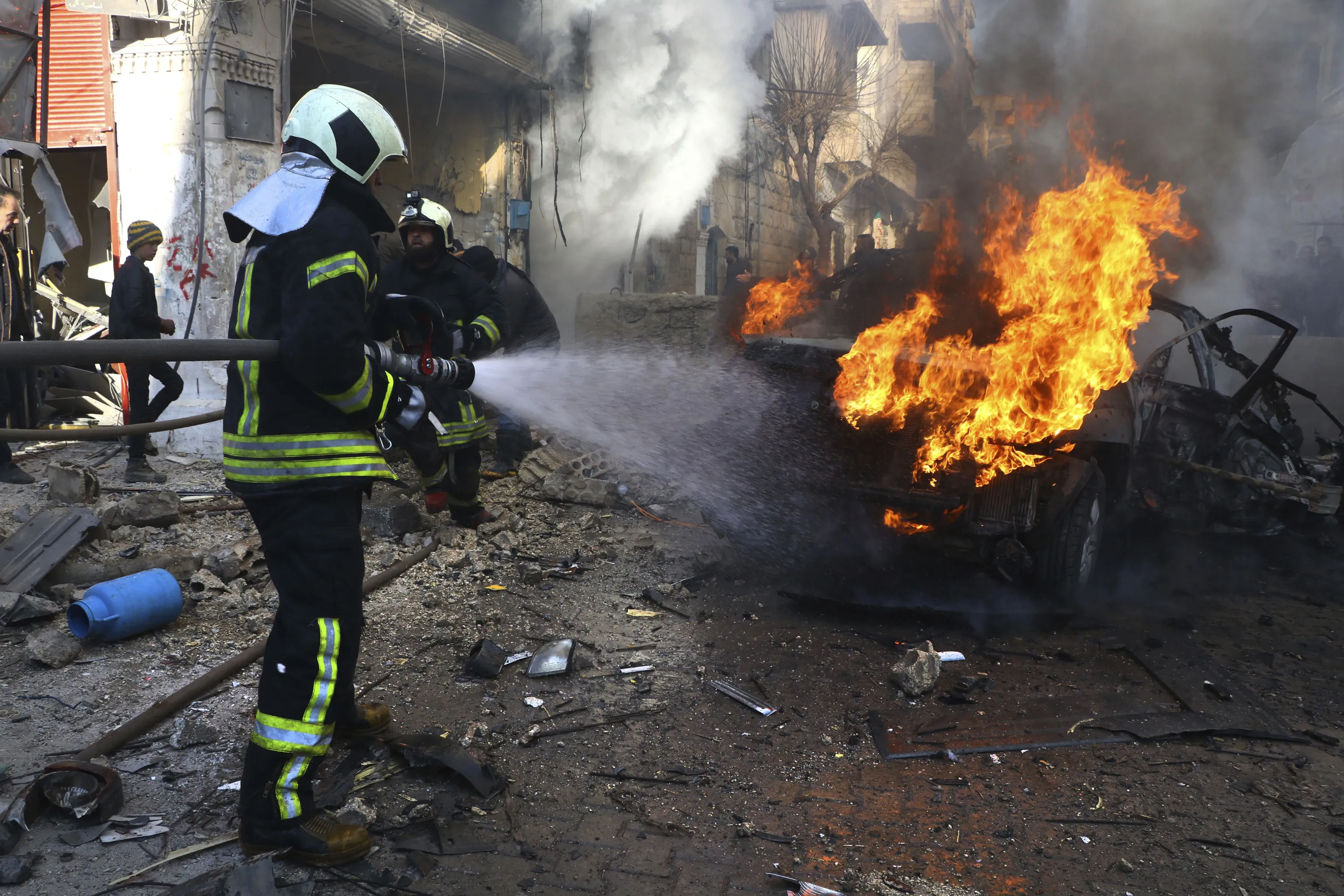 This photo provided by the Syrian Civil Defense White Helmets, which has been authenticated based on its contents and other AP reporting, shows a Syrian White Helmet civil defense worker, extinguishes flames rising from a burning car, in the town of Afrin, north of Aleppo, Thursday, January 20, 2022. The rocket attack on Afrin, controlled by Turkey-backed opposition fighters, killed several civilians and wounded over a dozen people on Thursday, Syrian rescuers and a war monitor said. Both blamed U.S-backed Syrian Kurdish forces for the attack. (Photo by Syrian Civil Defense White Helmets via AP Photo)
