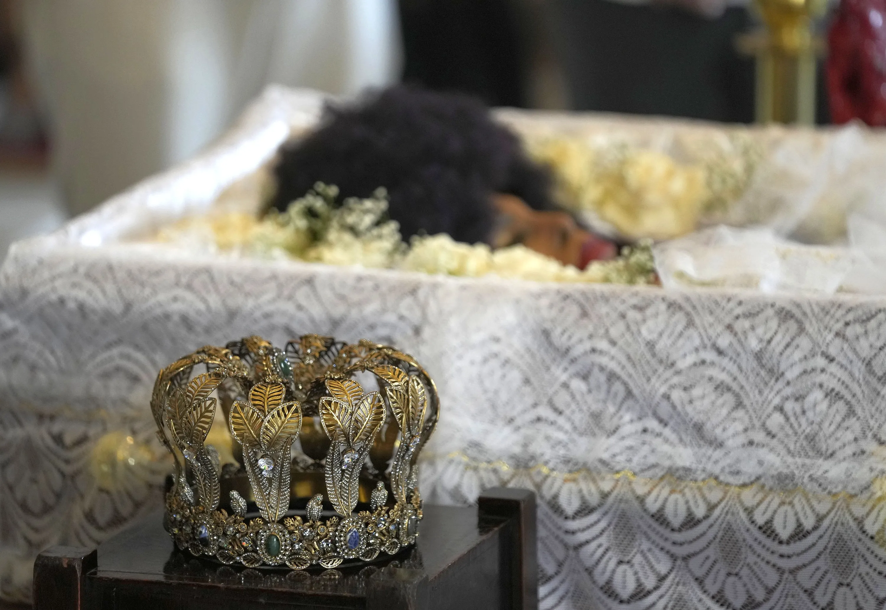 A crown sits on display next to the body of Brazilian samba singer Elza Soares as she lies in state at the Municipal Theater in Rio de Janeiro, Brazil, Friday, January 21, 2022. Soares died at age 91 of natural causes in her Rio de Janeiro home on Thursday afternoon, family members said on the artist's official Instagram account. (Photo by Silvia Izquierdo/AP Photo)