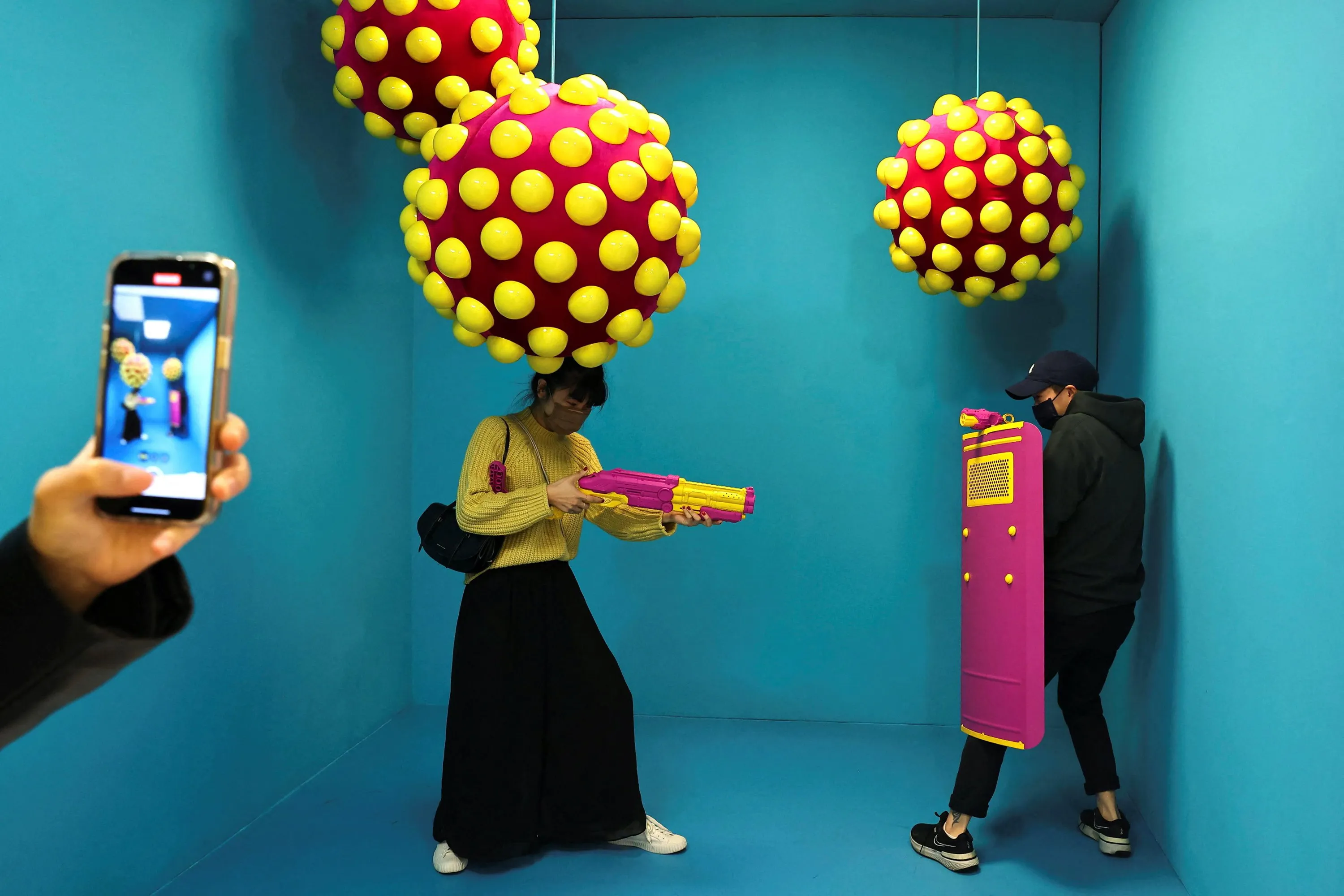 Visitors pose with props at the COVID-19 themed room at Gaki Hip, a pop up museum using everyday objects in Taiwan, such as bubble tea, claw-machines and pineapples, to encourage visitors to rethink the definition of Taiwan’s culture in Taipei, Taiwan on January 20, 2022. (Photo by Ann Wang/Reuters)