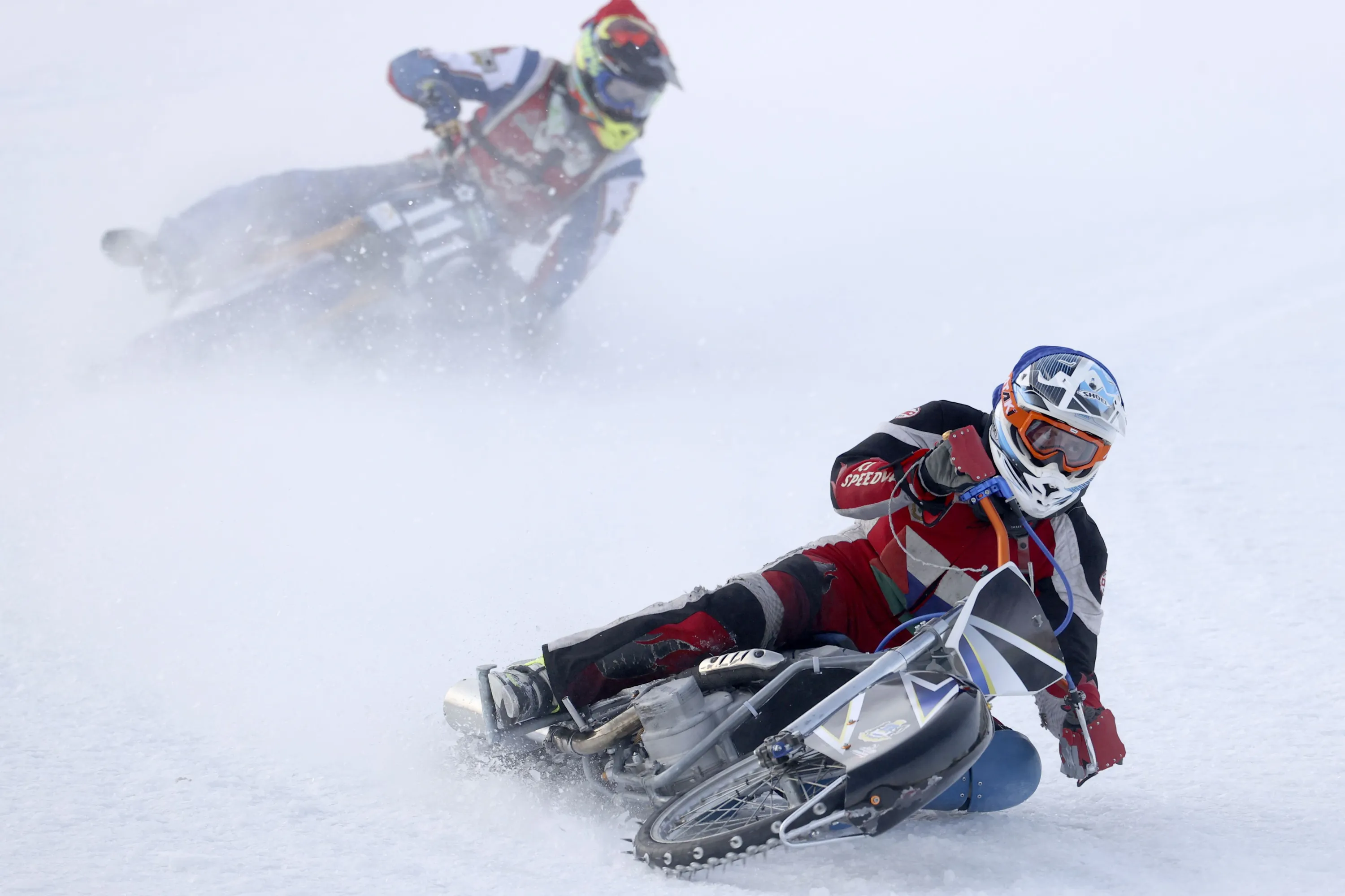 Participants compete in a race as part of the Siberia Ice Speedway Cup at a motorcycle racing track of the Volunteer Society for Cooperation with Army, Aviation, and Navy (DOSAAF) in Novosibirsk, Russia on January 16, 2022. (Photo by Kirill Kukhmar/TASS)