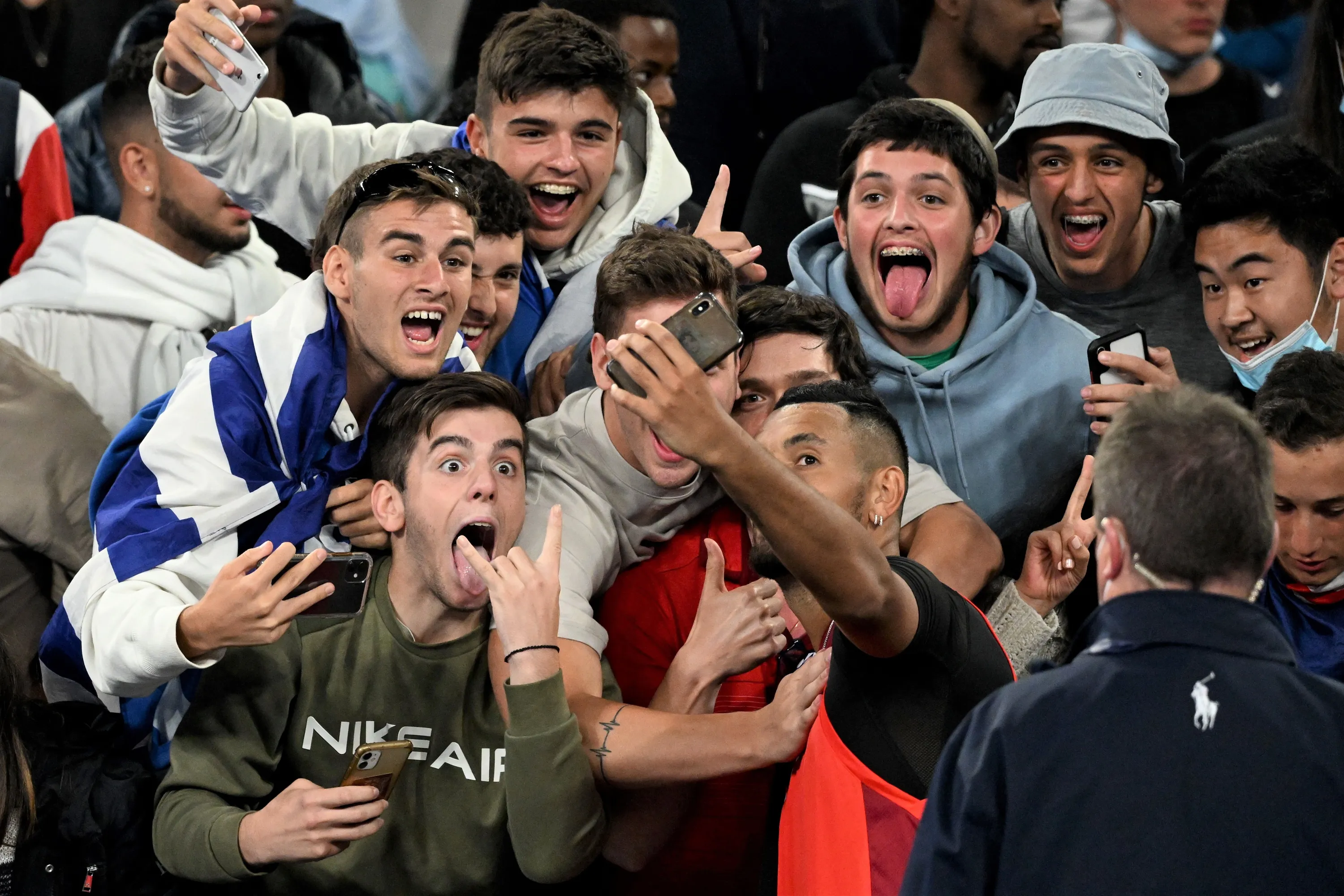 Nick Kyrgios of Australia takes selfies with spectators after winning his first round Men’s singles match against Liam Broady of Britain on Day 2 of the Australian Open, at Melbourne Park, in Melbourne, Australia, 18 January 2022. (Photo by Dave Hunt/EPA/EFE)