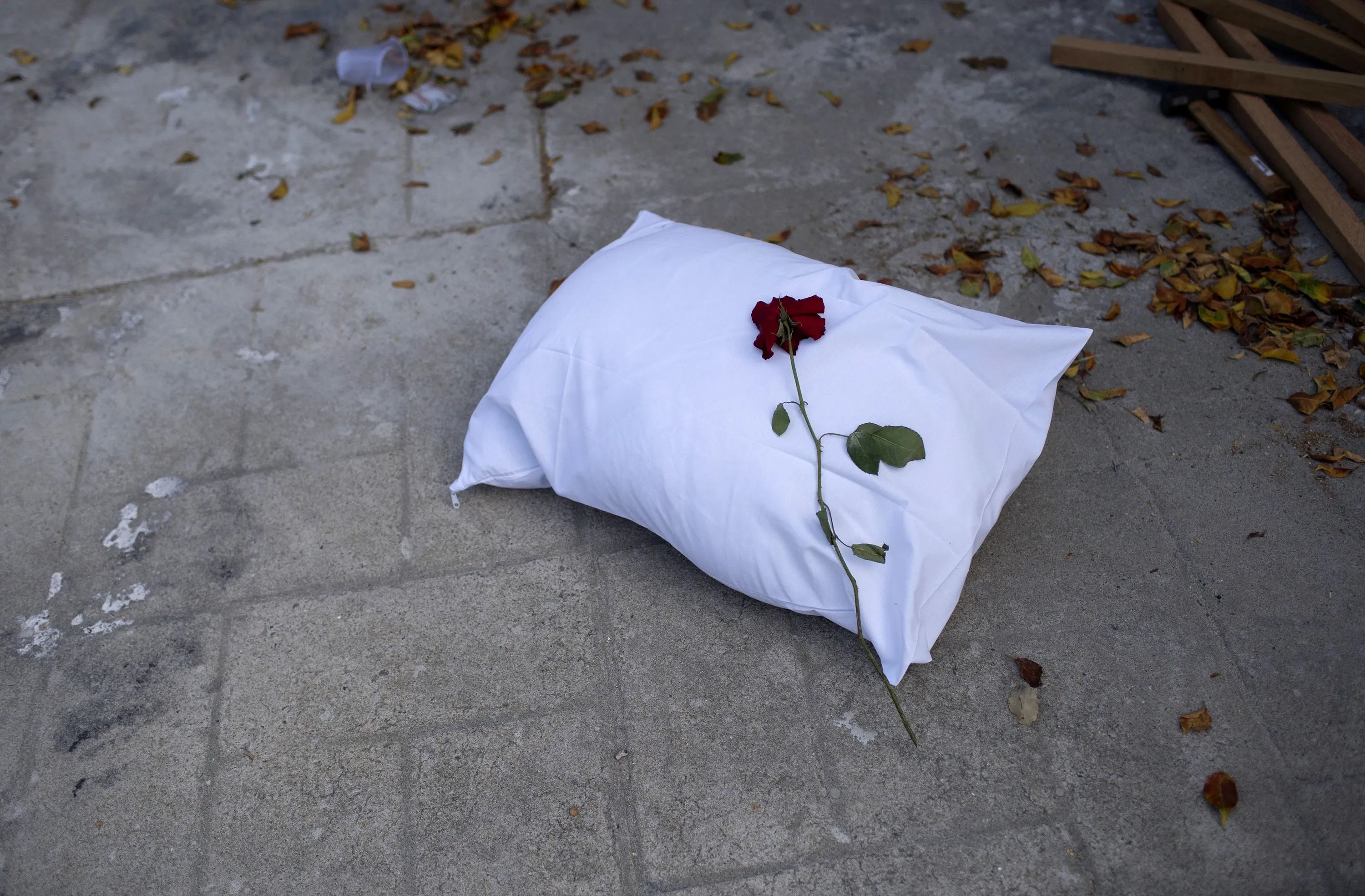 A pillow with a rose sits on the sidewalk during a protest against the Government's handling of the COVID-19 pandemic, organized by the Rio de Paz NGO in front of the Ronaldo Gazolla hospital in Rio de Janeiro, Brazil, Wednesday, March 24, 2021. (Photo by Silvia Izquierdo/AP Photo)