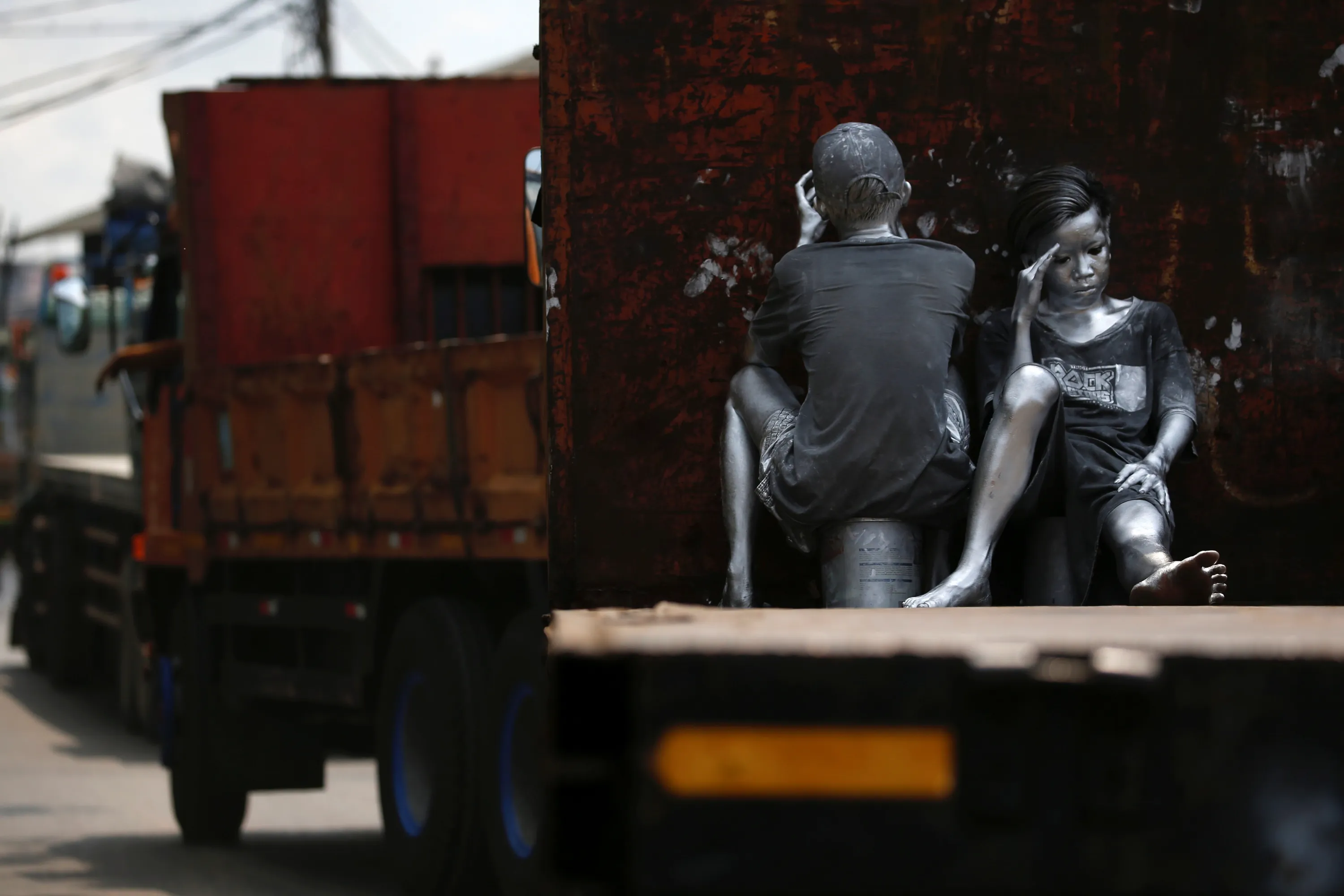 Youths, who covered themselves from head to toe in silver paint to become “manusia silver” (silvermen), as part of their act to make a living, ride on the back of a truck in Jakarta, Indonesia, March 31, 2021. (Photo by Willy Kurniawan/Reuters)