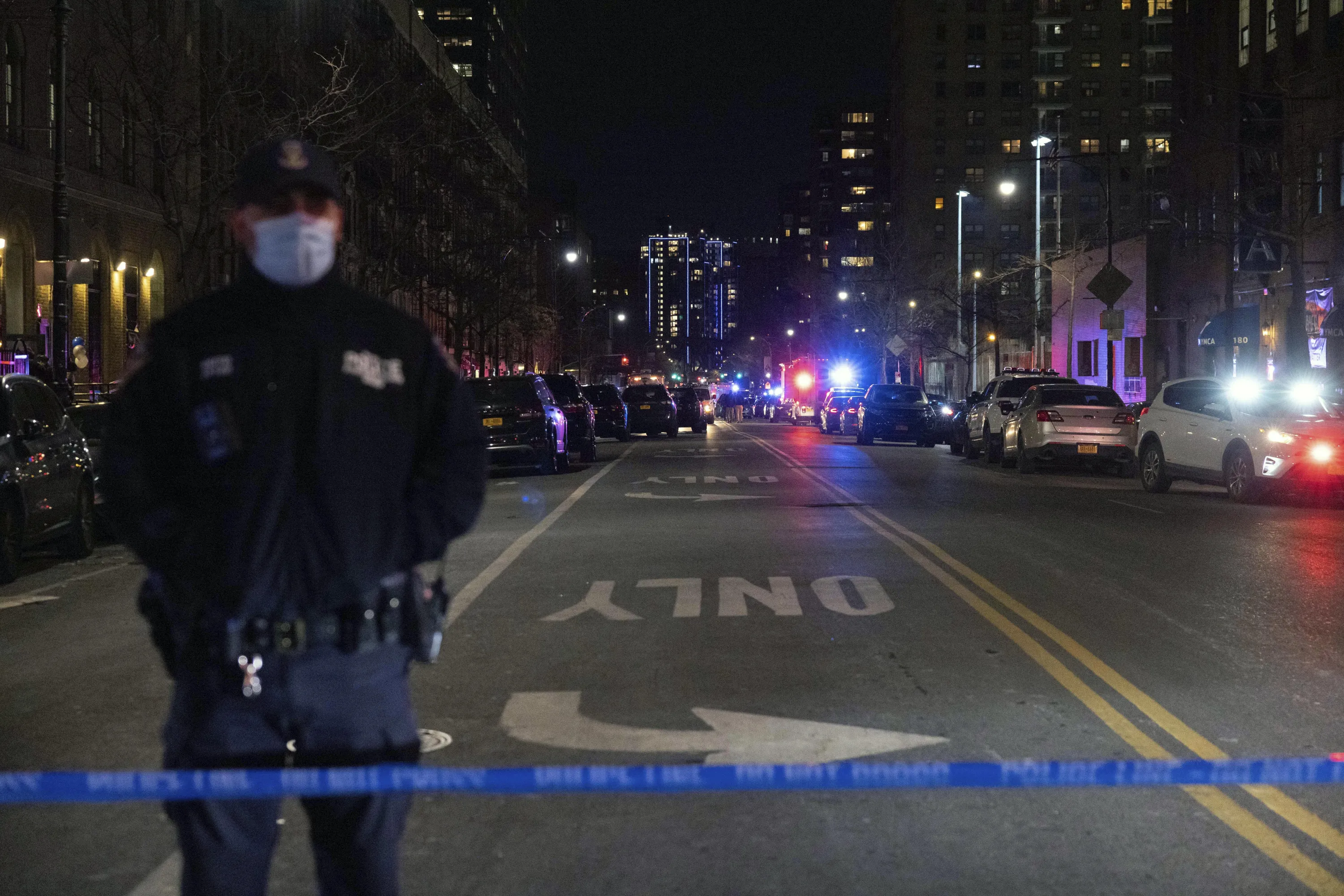 An NYPD officer stands at the scene of shooting in Harlem on Friday, January 21, 2022, in New York. A New York Police Department officer was killed and another gravely injured Friday night after responding to a domestic disturbance call, according to a law enforcement official. (Photo by Yuki Iwamura/AP Photo)