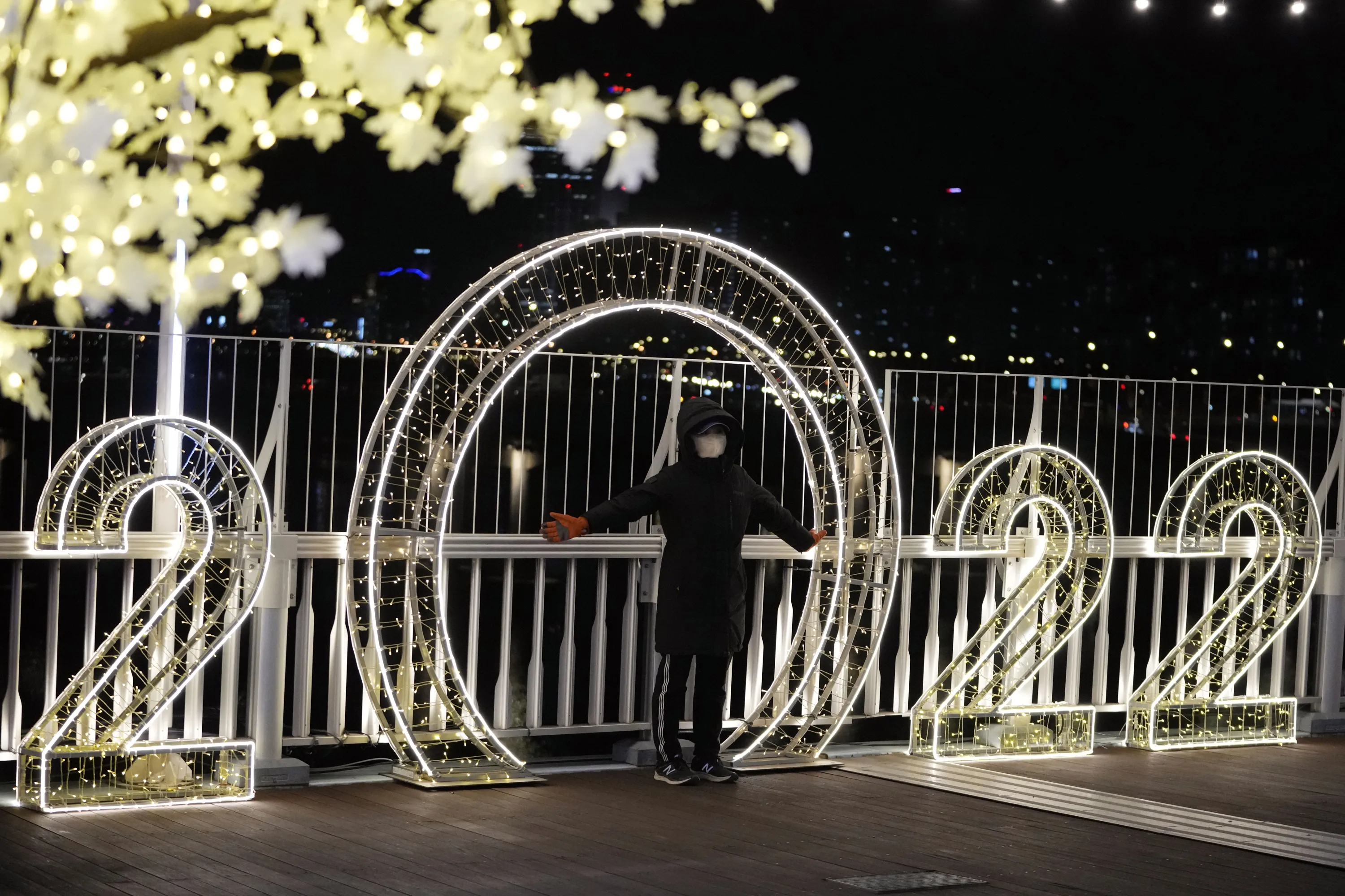 A visitor wearing a face mask poses for a photo in front of an illuminated decorations on New Year's Eve in Seoul, South Korea, Friday, December 31, 2021. (Photo by Lee Jin-man/AP Photo)