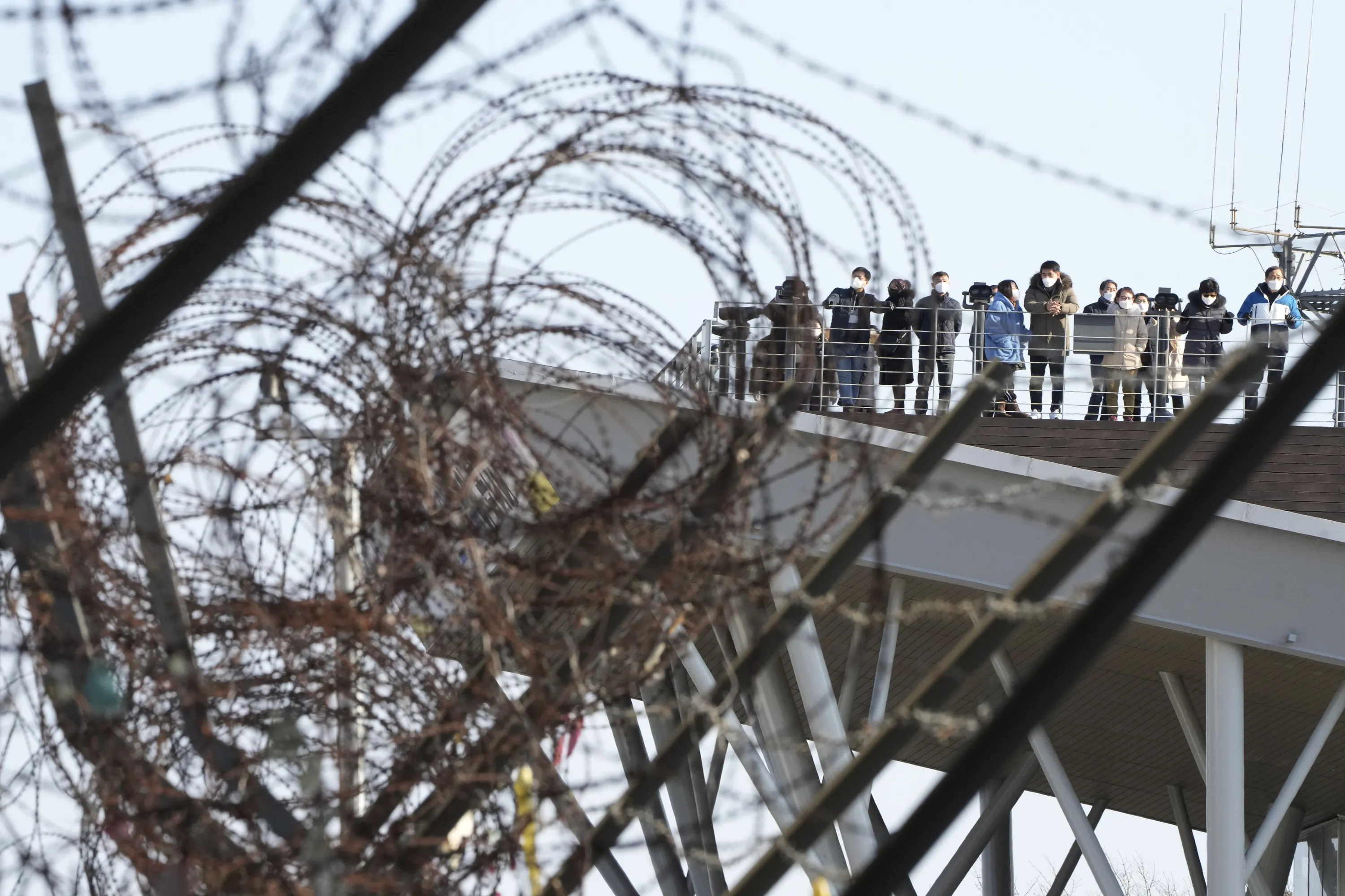 People watch the North Korean side as they visit to celebrate New Year at Imjingak Pavilion in Paju, near the border with North Korea, South Korea, Saturday, January 1, 2022. (Photo by Ahn Young-joon/AP Photo)