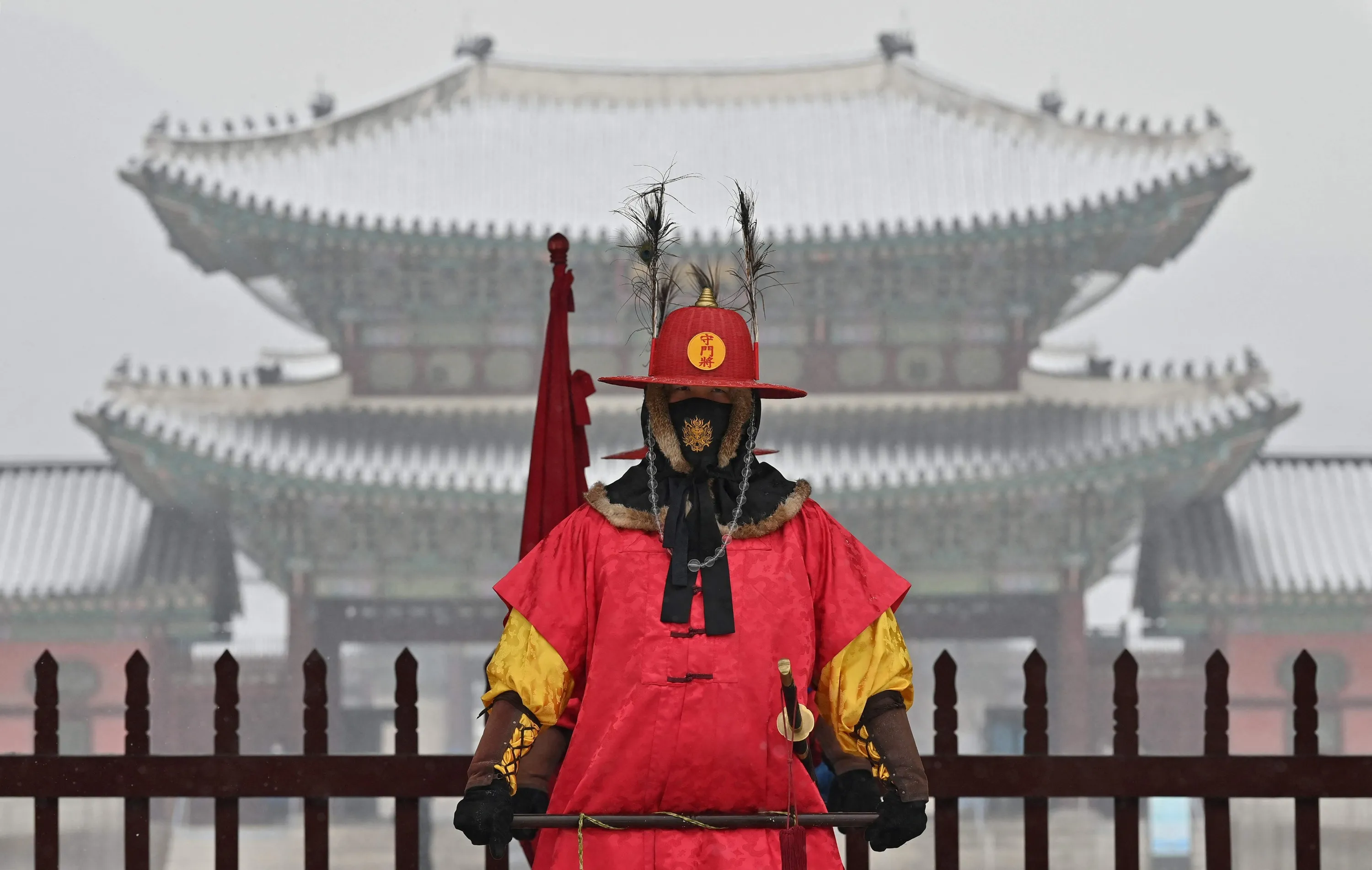 A “palace guard” stands for tourists in front of the snow-covered Gyeongbokgung Palace in central Seoul on January 19, 2022. (Photo by Jung Yeon-je/AFP Photo)