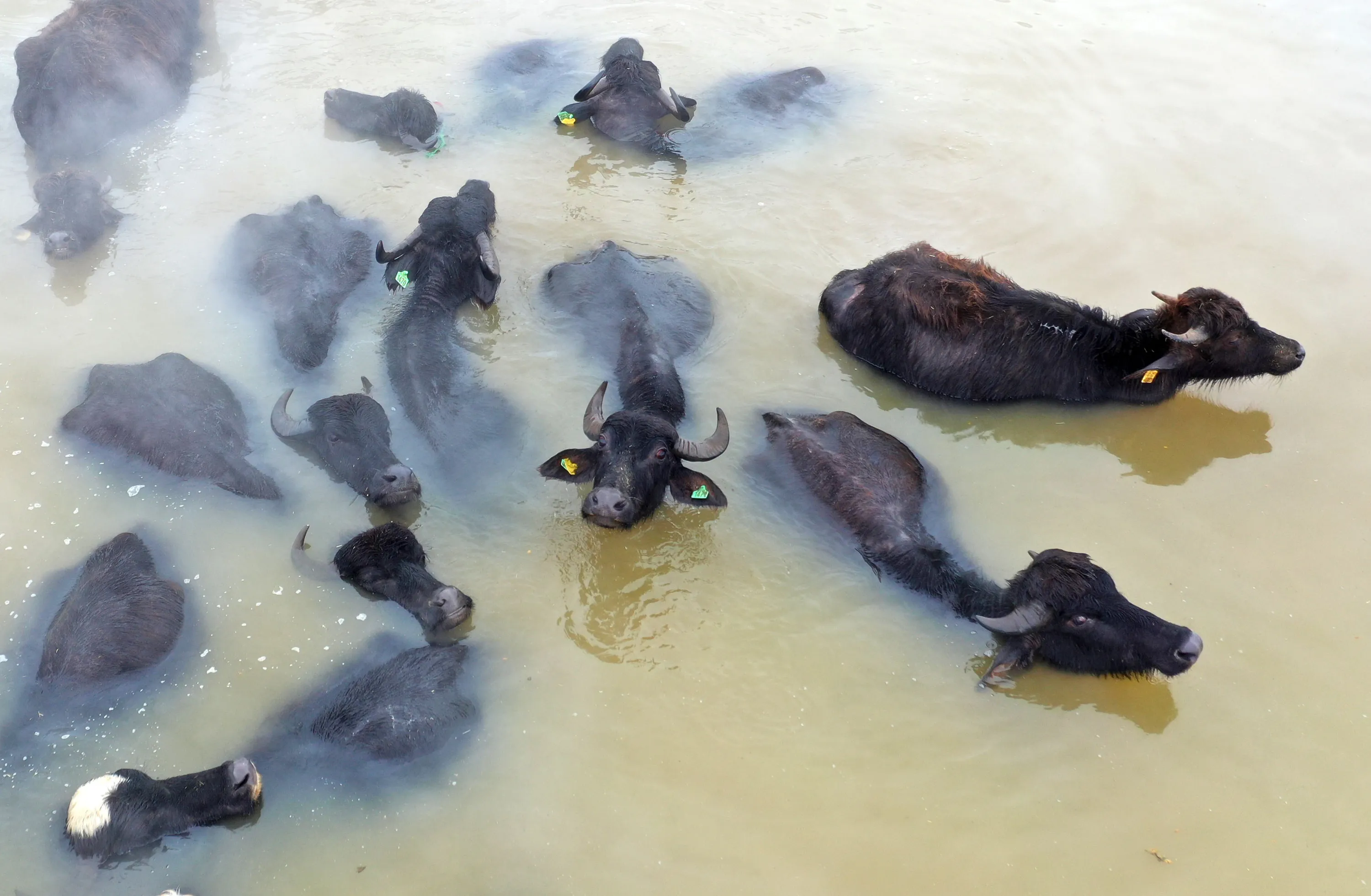 A drone photo shows buffalos are seen in a thermal water after they were brought by their breeders during winter season at Budakli village of Guroymak district in Bitlis, Turkey on January 02, 2022. In the district of Guroymak in Bitlis, buffalo breeders wash their animals thermal springs periodically, which are unclean in the barns in winter. In the village, where unfavorable weather conditions are effective, the buffaloes that get unclean in the barns because they cannot be taken outside, are washed in the hot spring water for healthier and milk yield. In the region where the temperature drops to minus 20 degrees, buffaloes and horses brought to the hot spring covered with snow are washed in the water where the steam rises. (Photo by Sener Toktas/Anadolu Agency via Getty Images)
