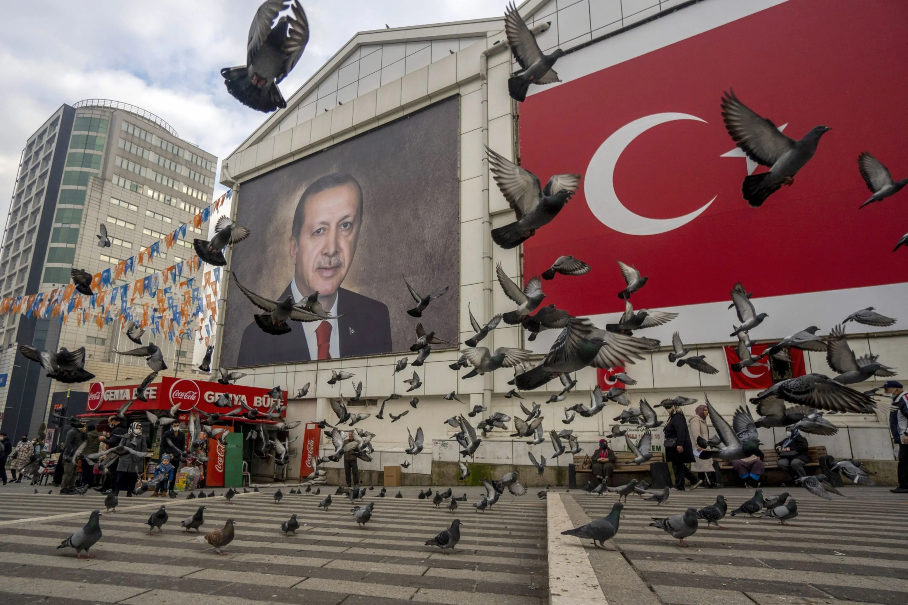 Pigeons take flight in front of a mural of Turkish President Recep Erdogan in Bursa, Turkey, on Tuesday, January 4, 2022. Turkish investors are still clinging to foreign currencies, undermining President Recep Tayyip Erdogan's plan to support the lira without raising interest rates. (Photo by Moe Zoyari/Bloomberg)