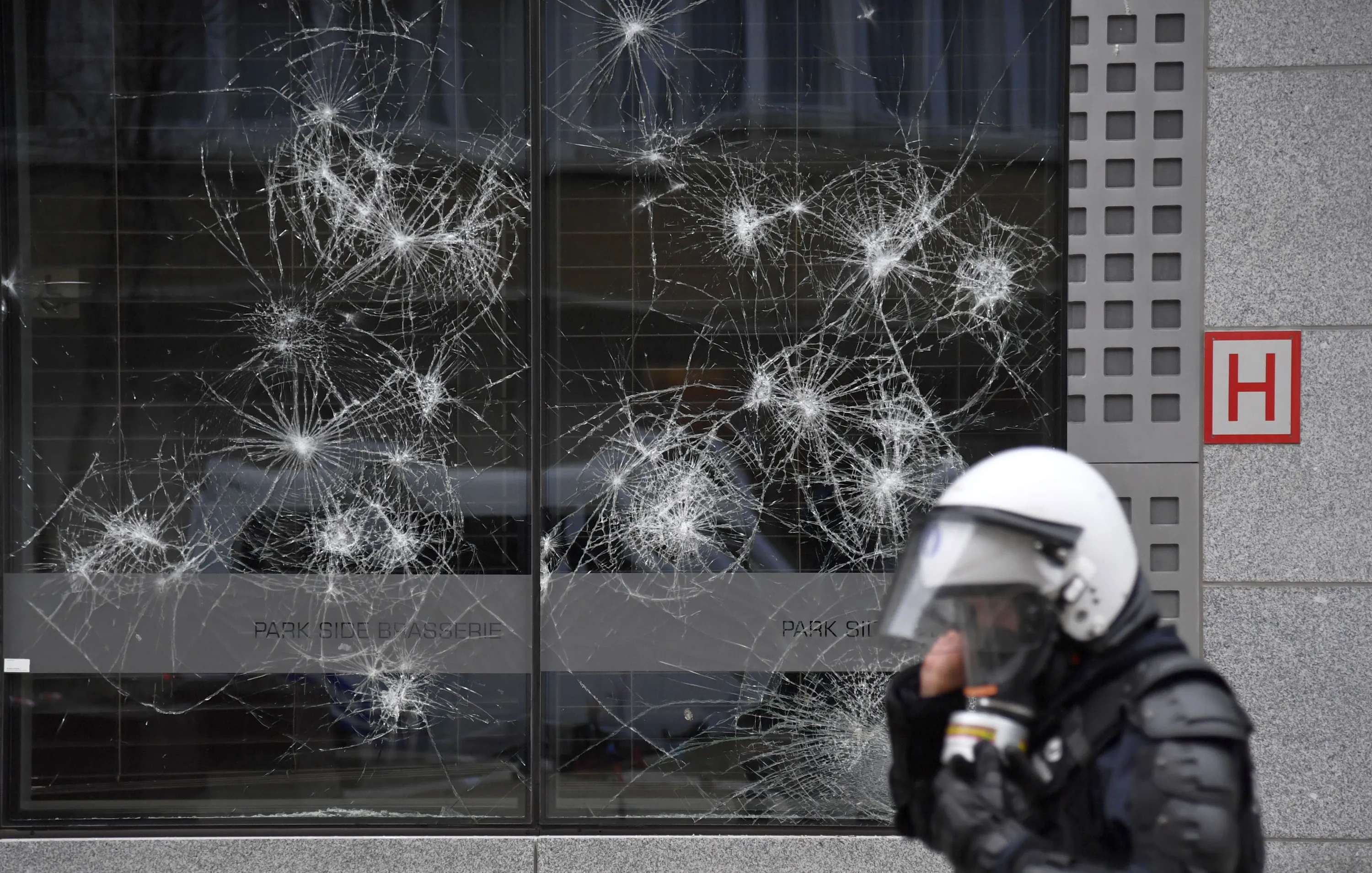 A police officer walks by a damaged building in the European Union quarter during a demonstration against COVID-19 measures in Brussels, Sunday, January 23, 2022. (Photo by Geert Vanden Wijngaert/AP Photo)