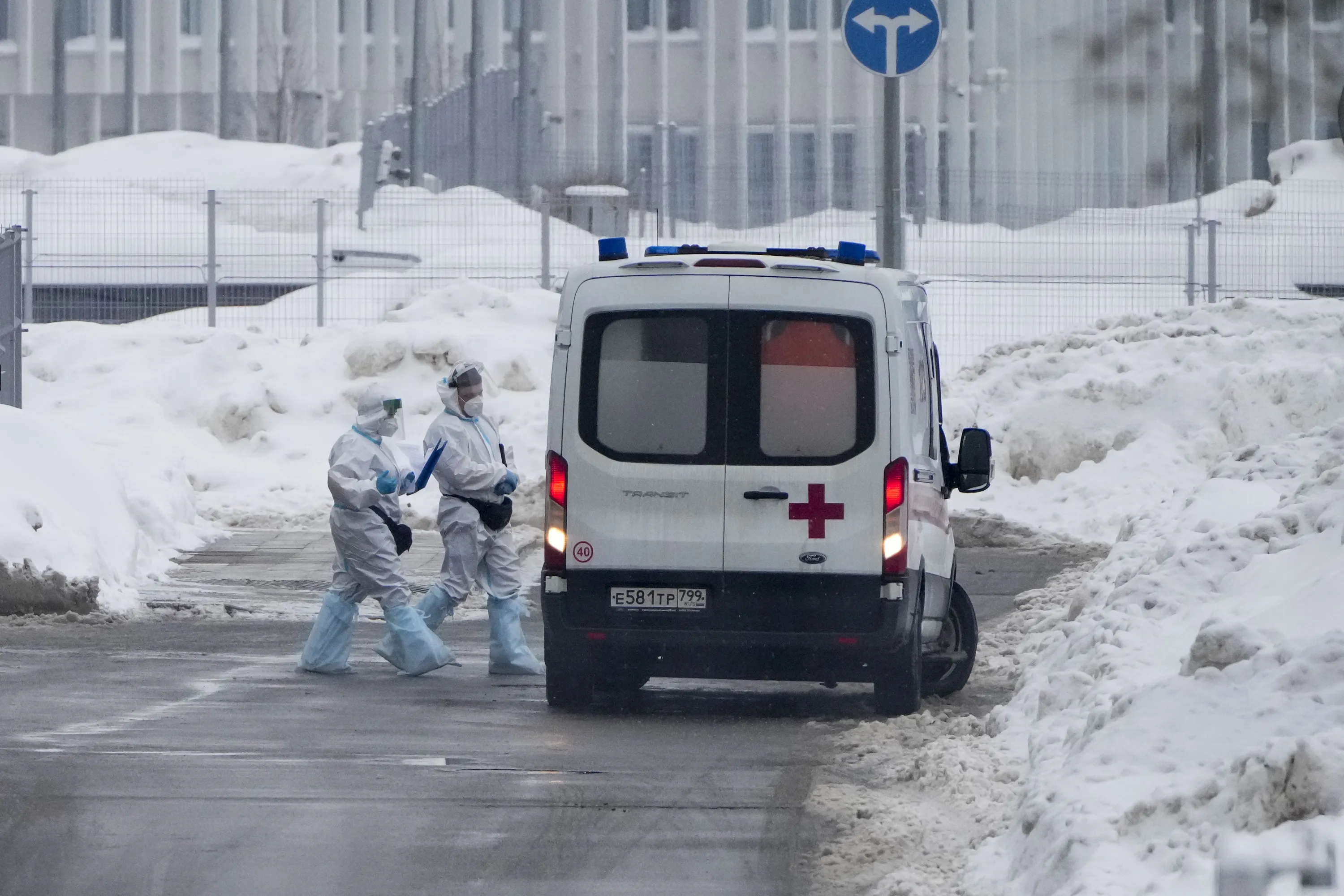 Medical workers walk to an ambulance at a hospital in Kommunarka, outside Moscow, Russia, Sunday, January 23, 2022. Daily new coronavirus infections in Russia have reached an all-time high and authorities are blaming the highly contagious omicron variant, which they expect to soon dominate the country's outbreak. (Photo by Alexander Zemlianichenko/AP Photo)