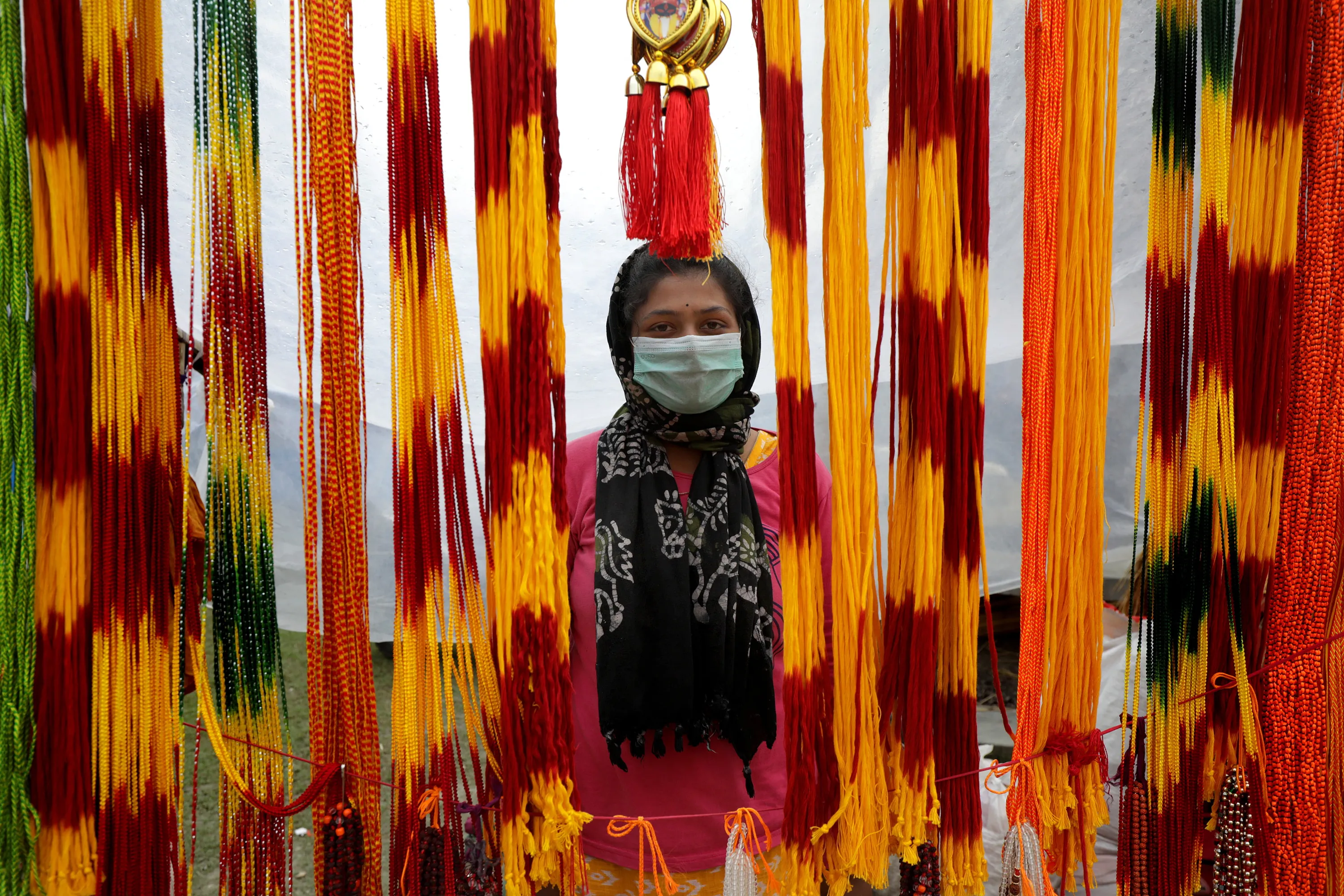 An Indian woman sells holy ropes at Sagar Island during annual fair amid of Covid crisis, 130km south of Kolkata, Eastern India, 13 January 2022. (Photo by Piyal Adhikary/EPA/EFE)