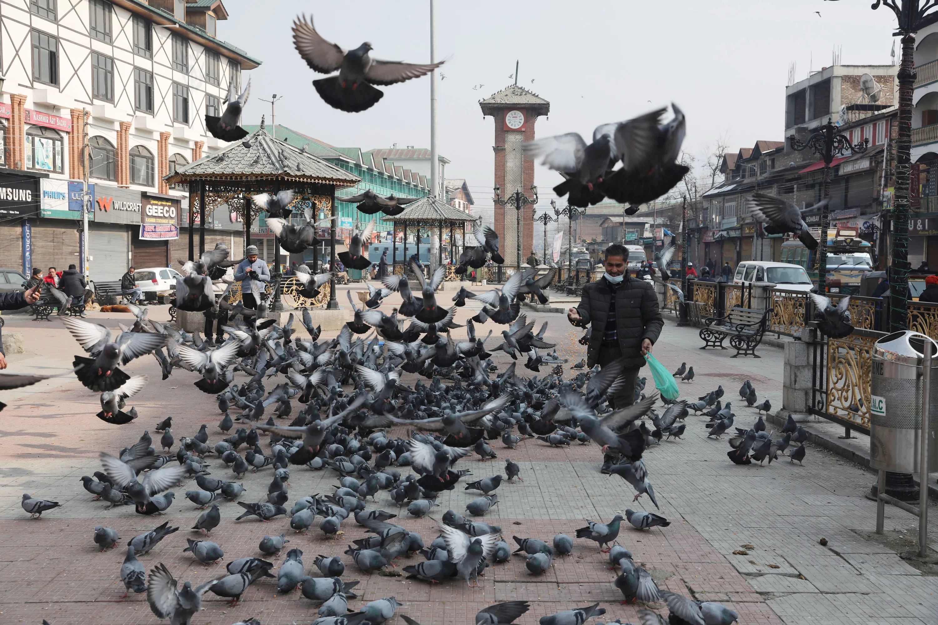 A man feed pigeons outside a closed market during lockdown in Srinagar, the summer capital of Indian Kashmir, 15 January 2022. Indian Kashmir is witnessing a huge spike in COVID-19 cases prompting the government to impose complete restrictions on non-essential movements during weekends in entire Jammu and Kashmir from this week. (Photo by Farooq Khan/EPA/EFE)