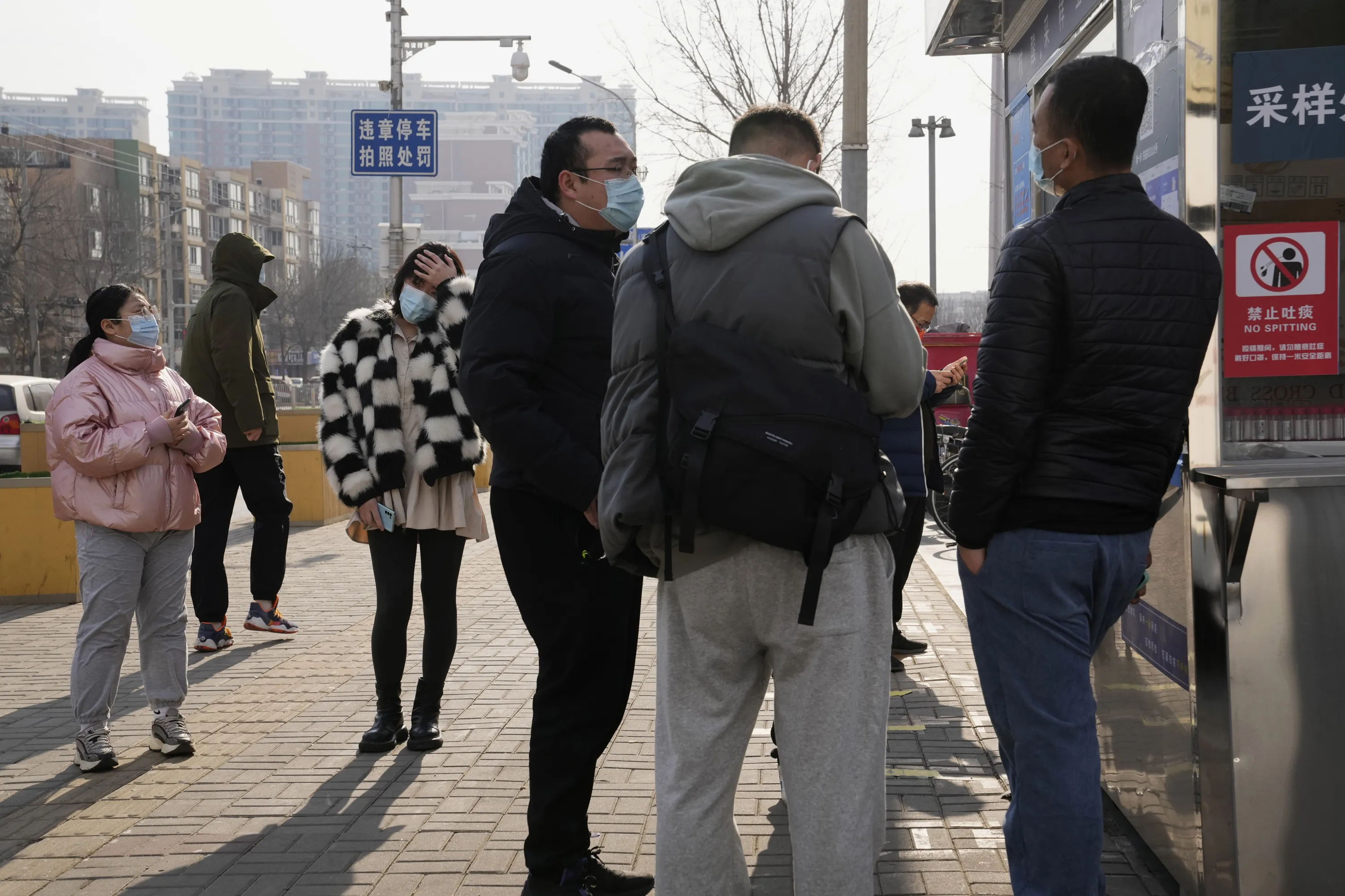 Workers and residents stand near a nuclei test station in Beijing, China, Tuesday, January 18, 2022. The first reported case of the omicron variant has prompted stepped-up measures in Beijing, just weeks before it hosts the Winter Olympic Games. (Photo by Ng Han Guan/AP Photo)