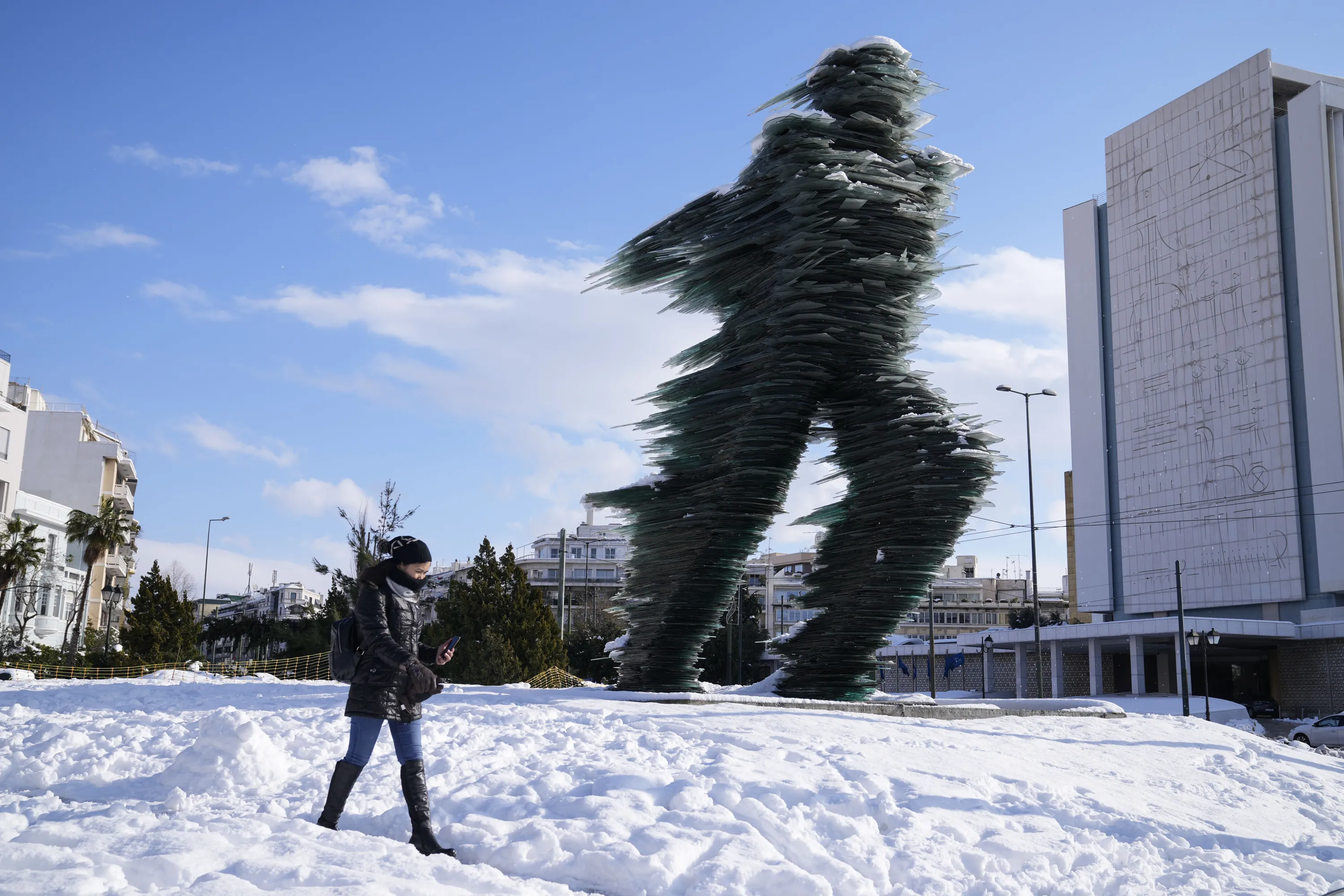 A woman walks past a the Runner, sculptured by Kostas Varotsos, after a snowstorm, in Athens, on Tuesday, January 25, 2022. A snowstorm of rare severity disrupted road and air traffic Monday in the Greek capital of Athens and neighboring Turkey's largest city of Istanbul, while most of Greece, including – unusually – several Aegean islands, and much of Turkey were blanketed by snow. (Photo by Thanassis Stavrakis/AP Photo)