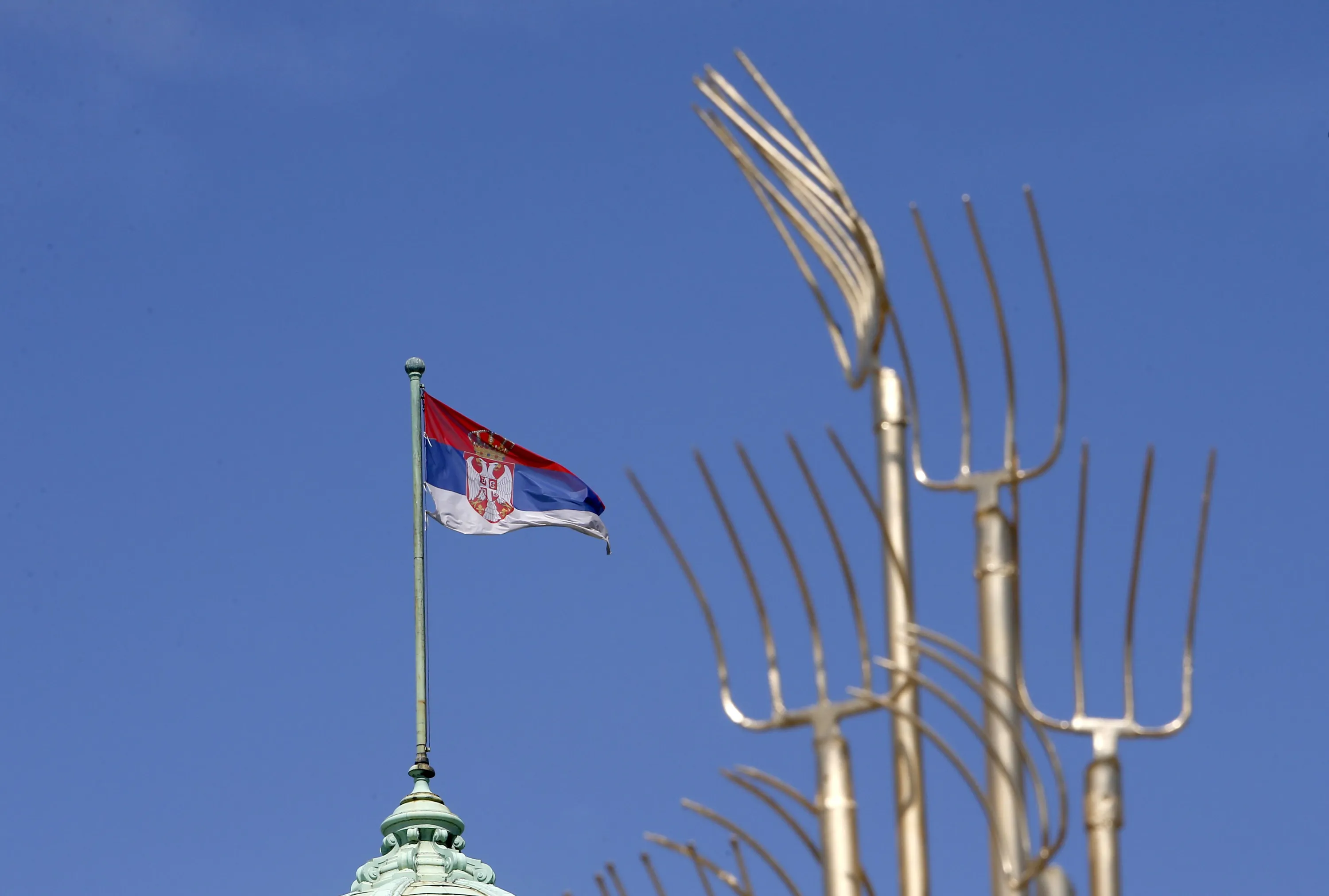 A Serbian flag waves on the Serbian Parliament building during a protest in front of the Serbian Parliament building in Belgrade, Serbia, Saturday, April 10, 2021. Environmental activists are protesting against worsening environmental situation in Serbia. (Photo by Darko Vojinovic/AP Photo)