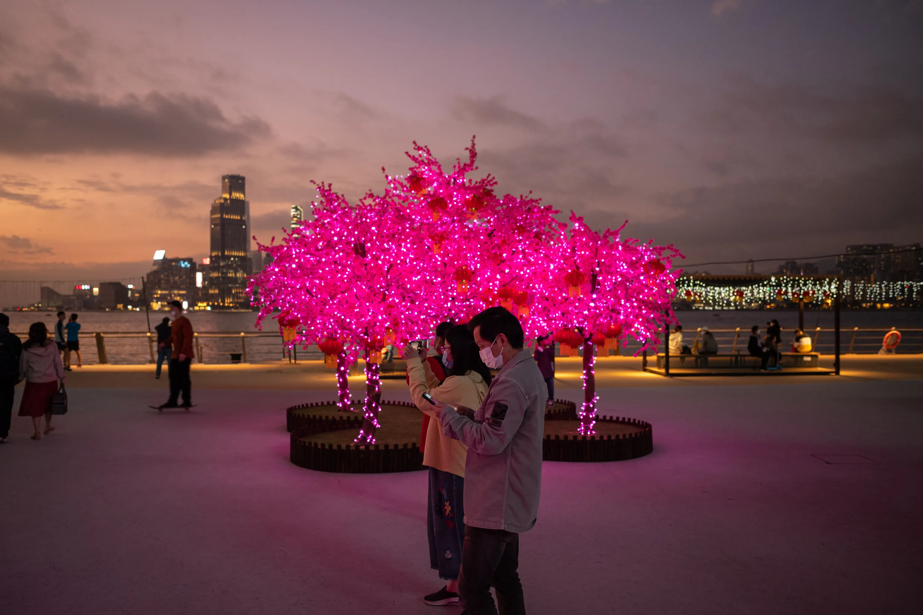 People take photos of a mock peach blossom tree in a park on the Victoria Harbour waterfront in Hong Kong, China, 25 January 2022. The park is decorated with mock peach blossom trees, some of the most popular flowers during Lunar New Year, which falls on 01 February 2022 and celebrates the Year of the Tiger. (Photo by Jerome Favre/EPA/EFE)