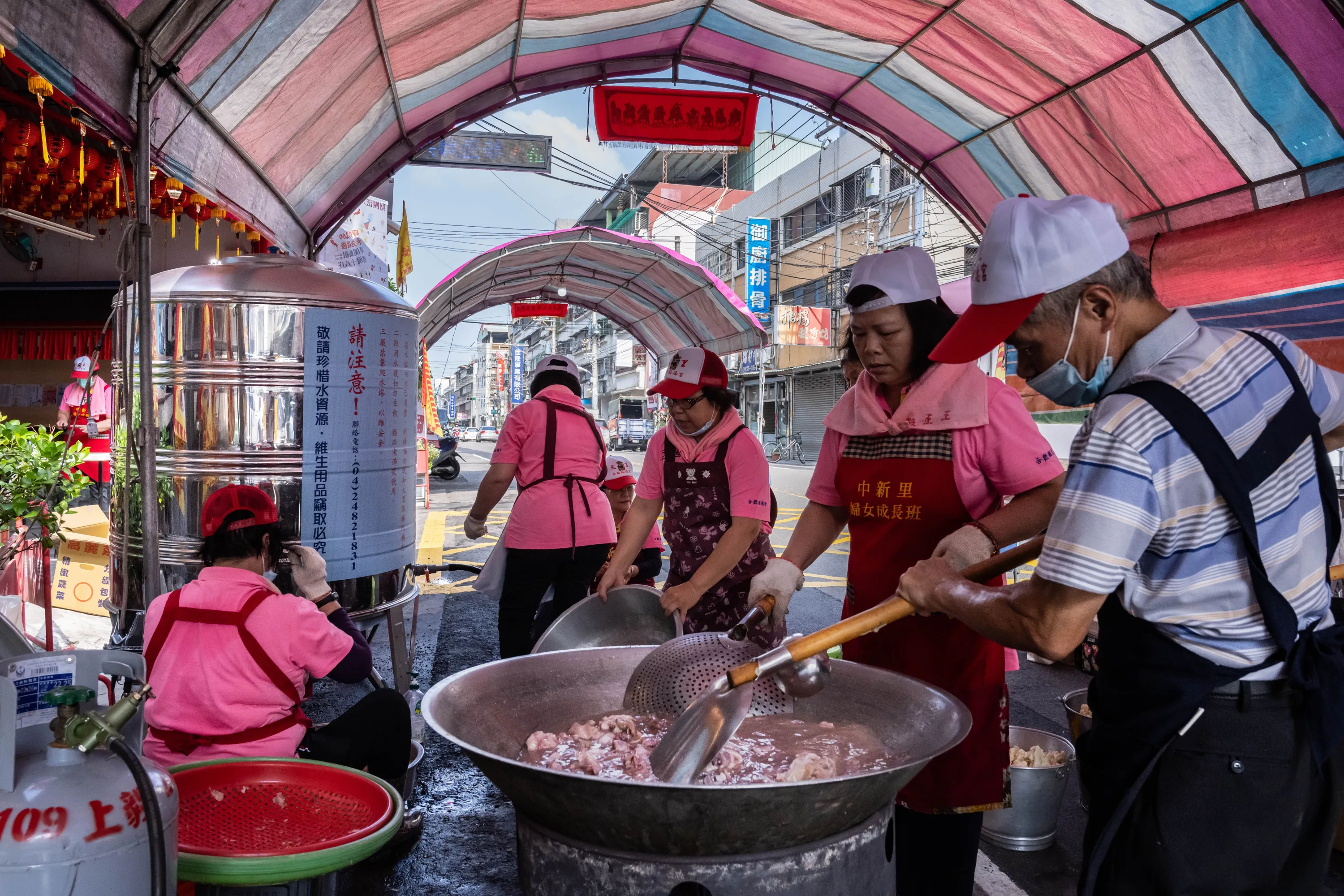 People cook in front of a water station in their neighbourhood during a water ration on April 20, 2021 in Taichung, Taiwan. (Photo by Billy H.C. Kwok/Getty Images)