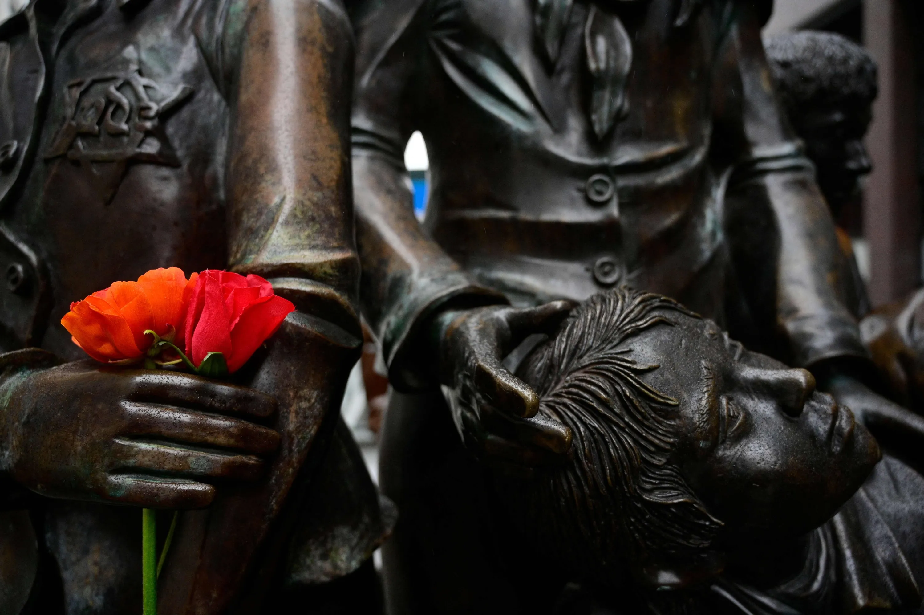 Roses are placed in the hand of one of the statues part of the “Trains to Life – Trains to Death” bronze sculpture at Berlin's Friedrichstrasse street on January 27, 2022, the International Holocaust Remembrance Day. The sculpture is dedicated to Jewish children saved by so-called "Kindertransporte" which brought them to the United Kingdom and other countries, as well as to children brought by trains to the Nazi death camps. Israeli architect and sculptor Frank Meisler, who made the sculpture, was himself evacuated with a children's transport and survived the Holocaust, whereas his parents were killed in Auschwitz. (Photo by John MacDougall/AFP Photo)