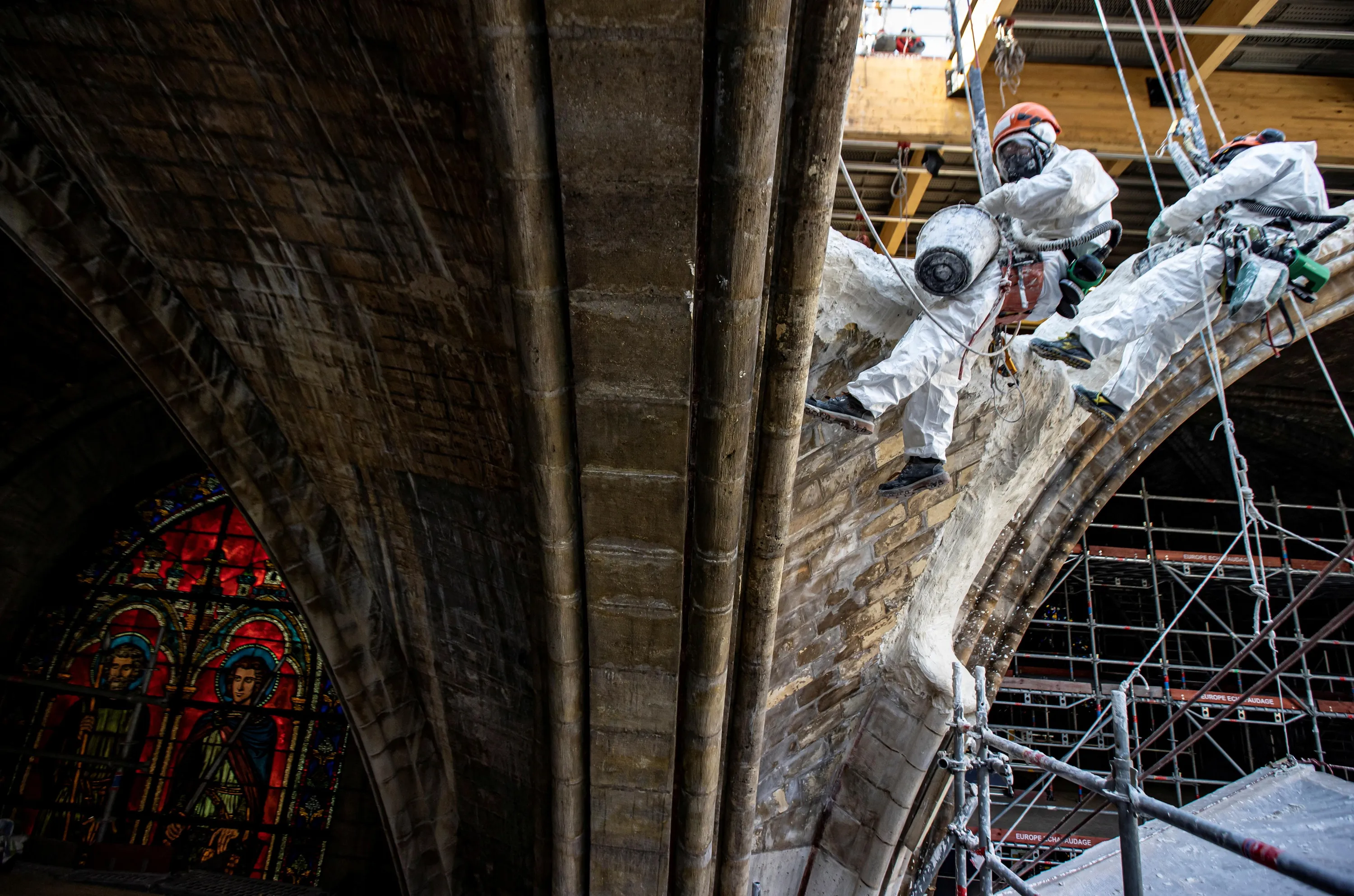 Workmen plaster stonework as they rappel down a vault at the Notre-Dame de Paris Cathedral, which was damaged in a devastating fire two years ago, as restoration works continue in Paris, France, April 15, 2021. (Photo by Ian Langsdon/Pool via Reuters)