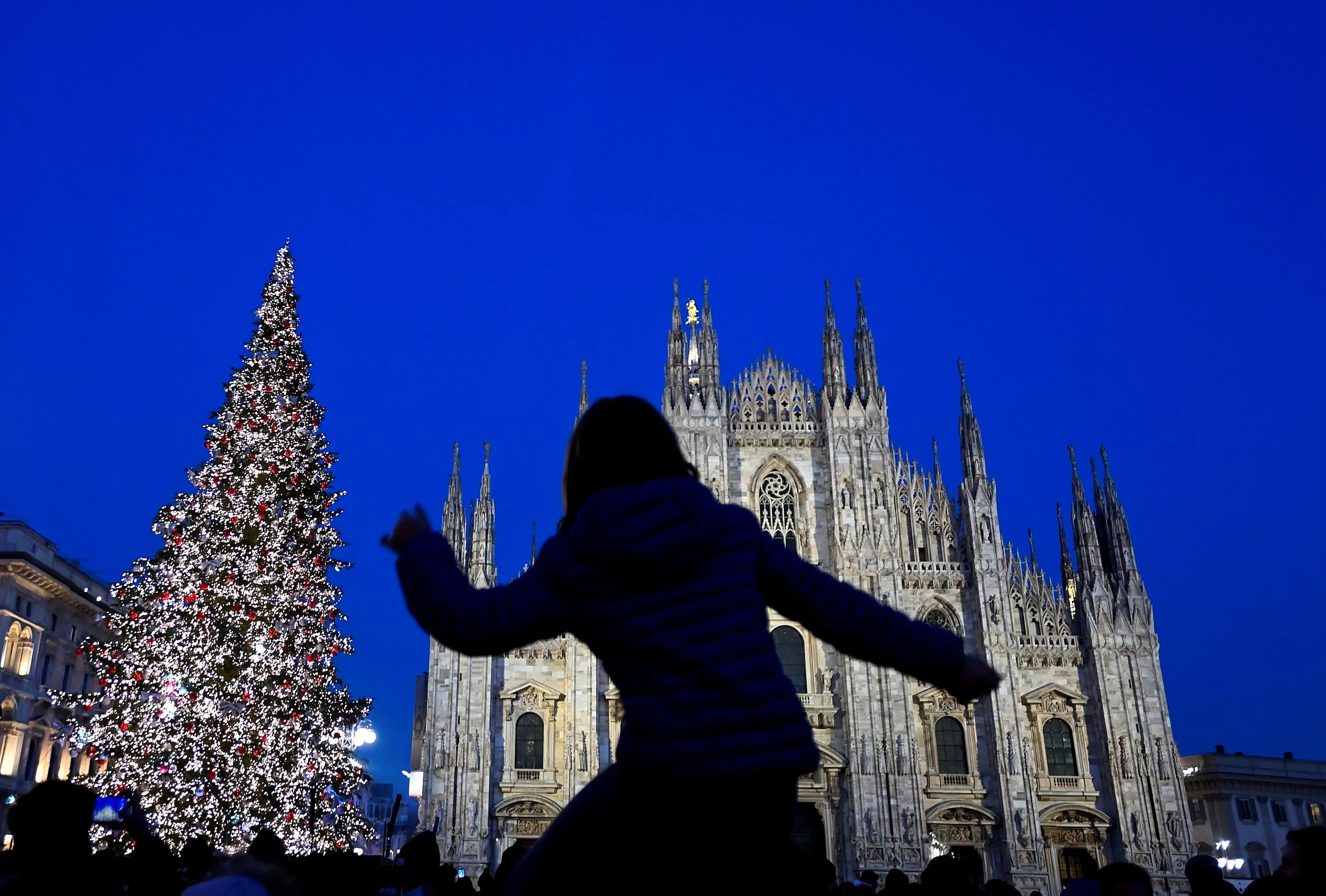 People admire a lit Christmas tree in Duomo Square in Milan, Italy, December 6, 2021. (Photo by Flavio Lo Scalzo/Reuters)