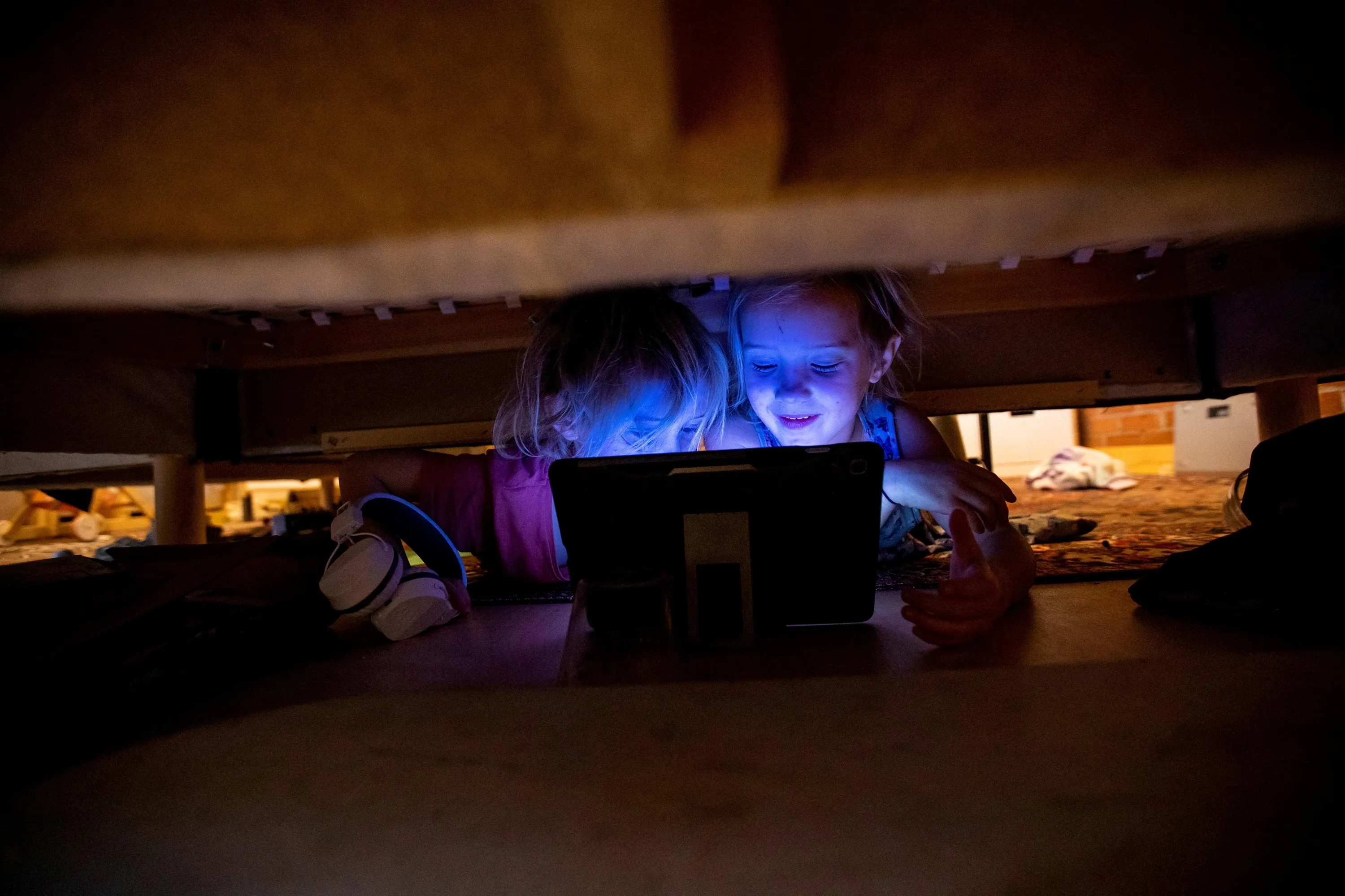 Nora and Willa Stief prepare for online school while their parents work from home and take care of a todler amid surging COVID-19 cases caused by the coronavirus Omicron variant, in Hamilton, Ontario, Canada on January 7, 2022. (Photo by Carlos Osorio/Reuters)
