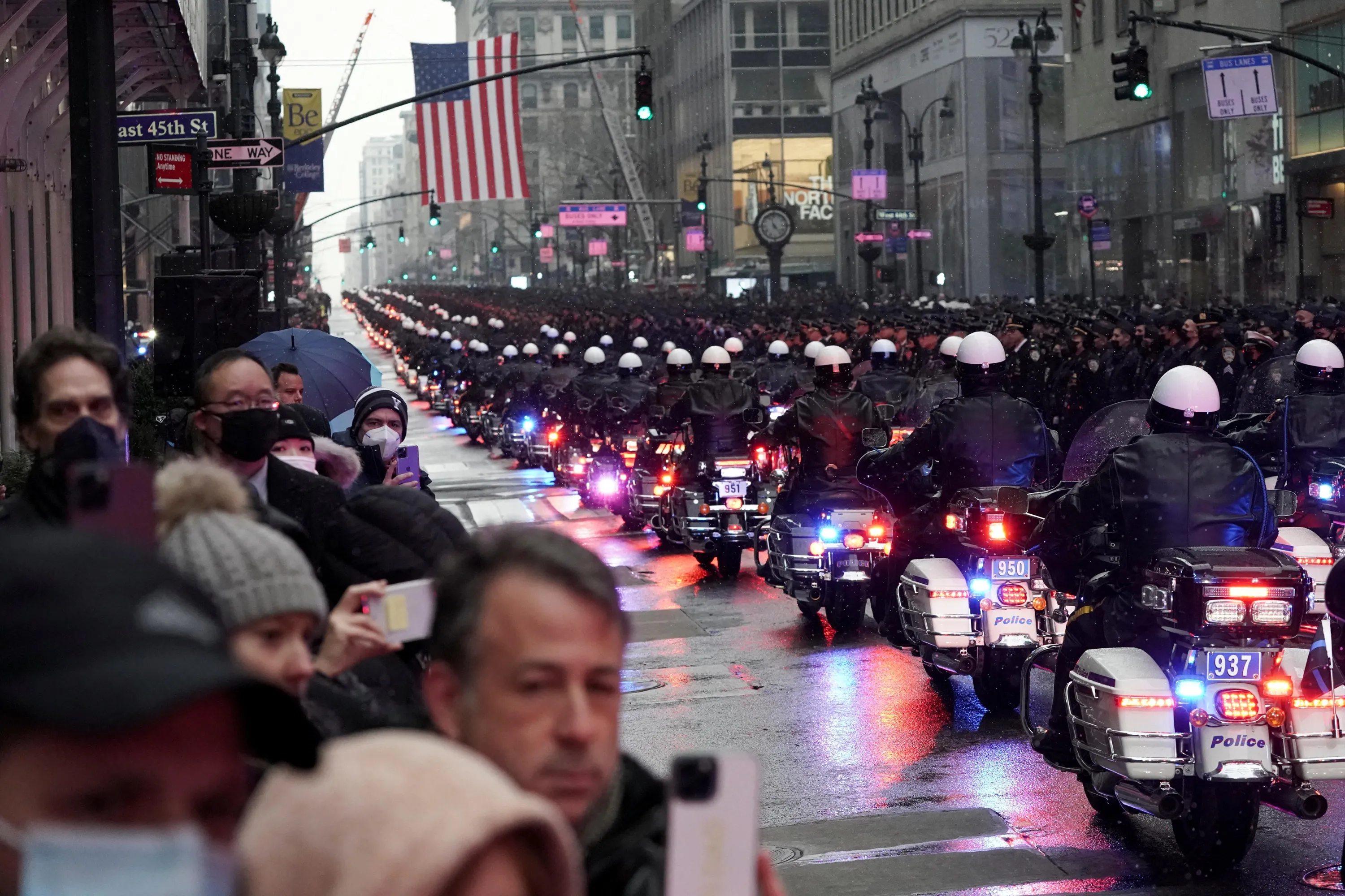 Police officers ride motorcycles during funeral service for New York City Police Department (NYPD) officer Jason Rivera, who was killed in the line of duty while responding to a domestic violence call, at St. Patrick's Cathedral in the Manhattan borough of New York City, U.S., January 28, 2022. (Photo by Jeenah Moon/Reuters)