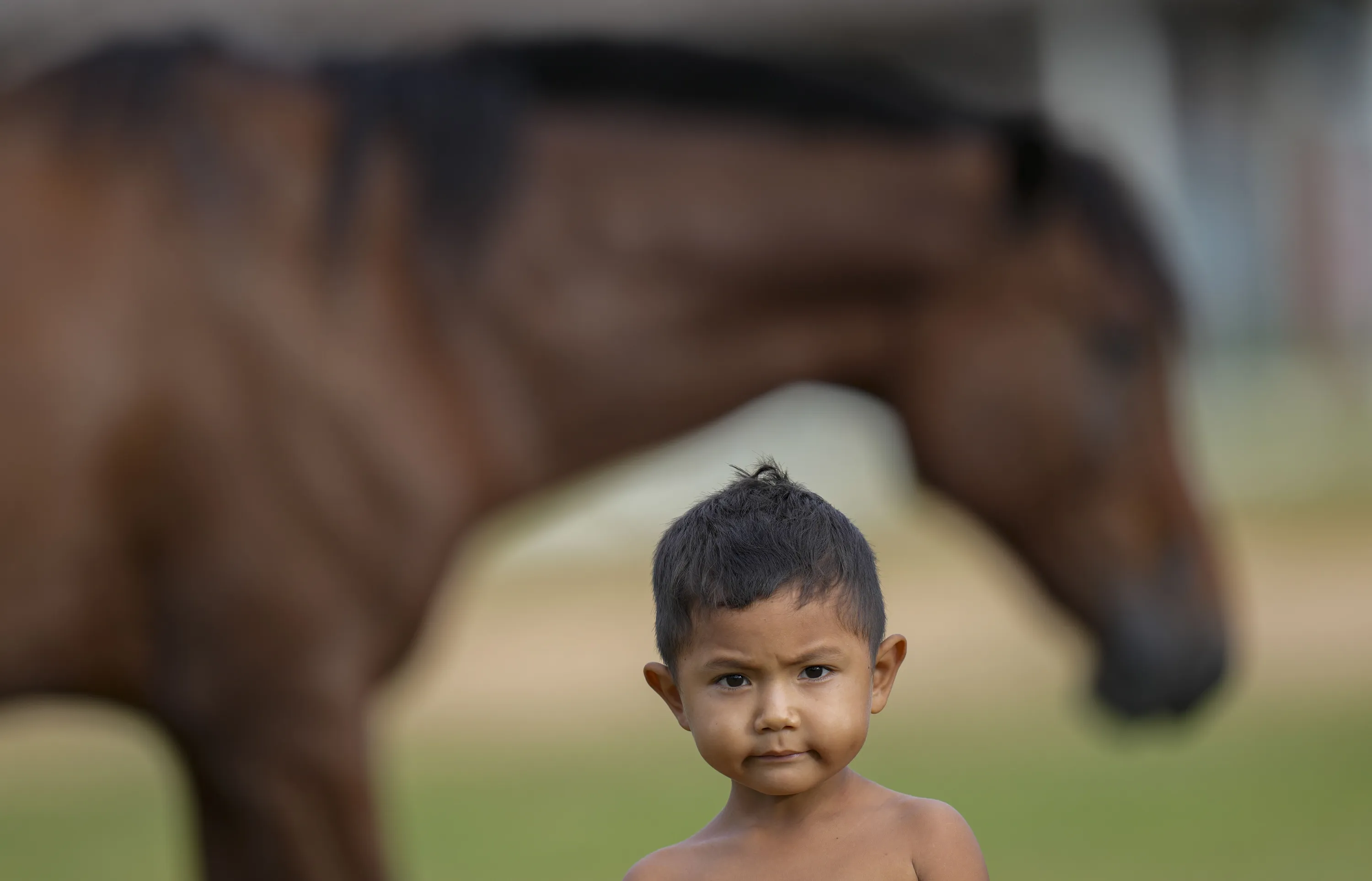 A young member of the Macuxi ethnic group stand near a horse in the Maturuca community of the Raposa Serra do Sol Indigenous reserve in Roraima state, Brazil, Sunday, November 7, 2021. Bordering Venezuela and Guyana, the Indigenous territory is bigger than Connecticut and home to 26,000 people from five different ethnicities. (Photo by Andre Penner/AP Photo)