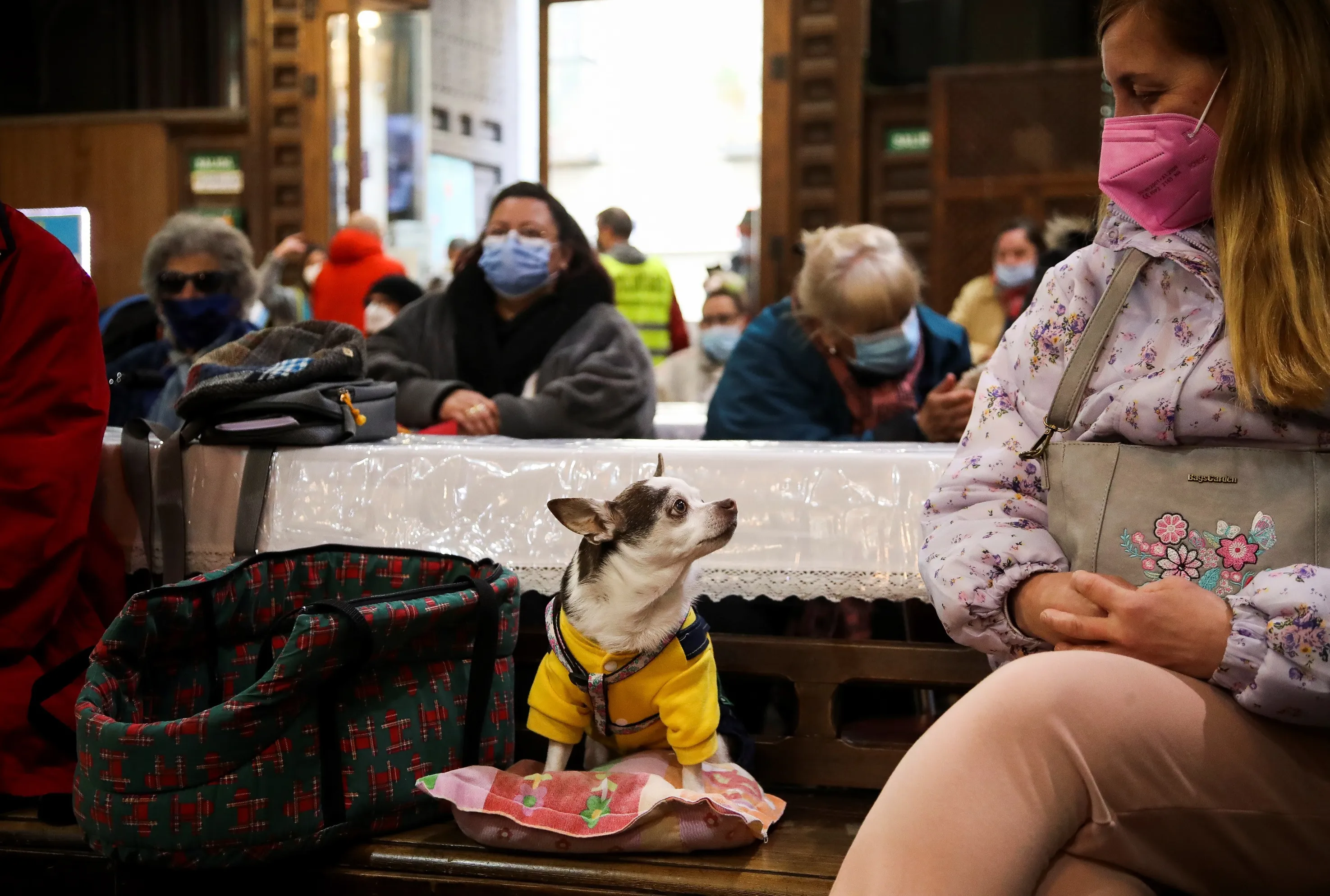 A woman and her dog attend a mass at San Anton Church to mark the feast day of San Anton, Spain's patron saint of animals, in downtown Madrid, Spain, 17 January 2022. (Photo by David Fernandez/EPA/EFE)