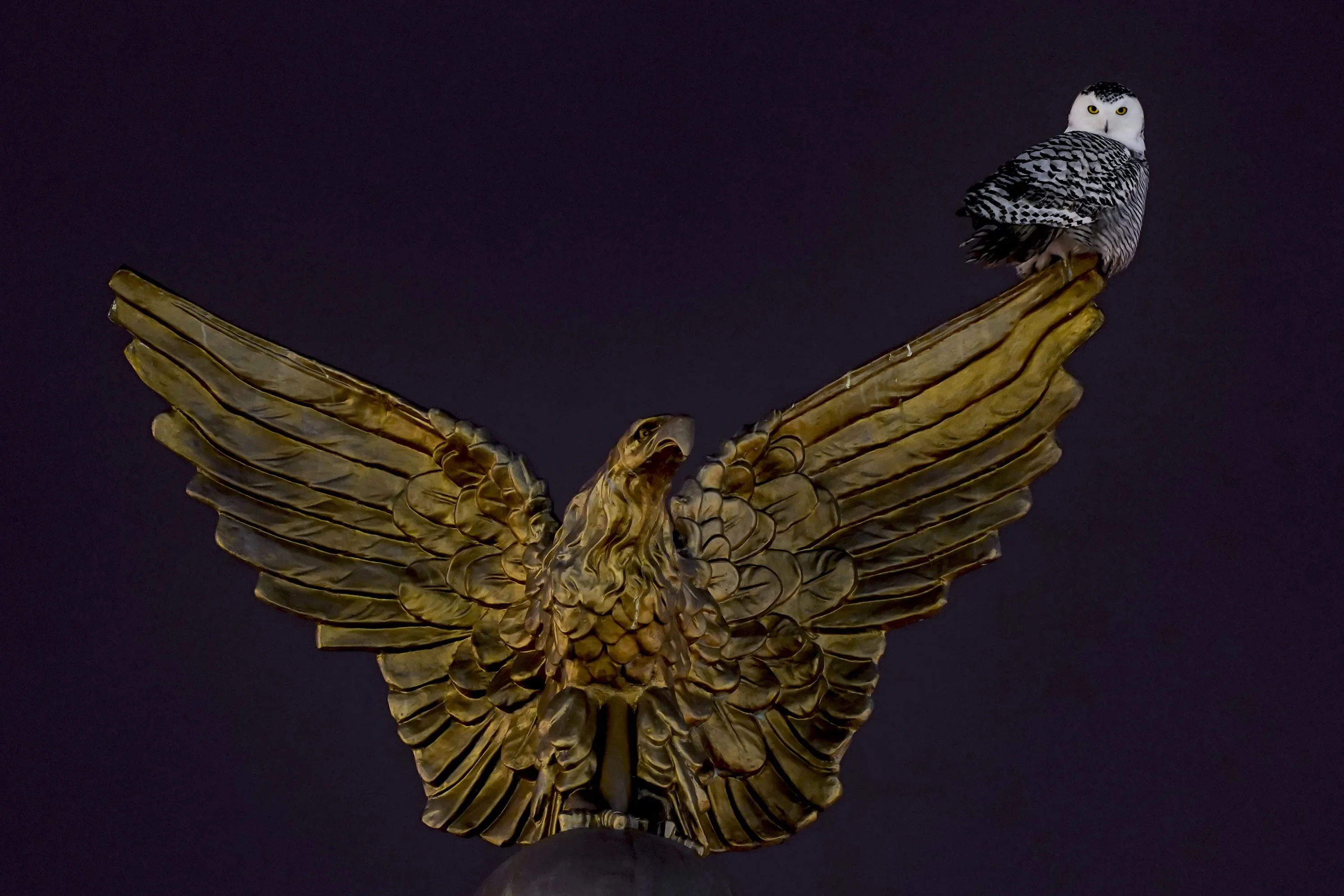 A rare snowy owl perches on a bald eagle flag pole topper in front of Union Station in Washington, Thursday, January 13, 2022. (Photo by Carolyn Kaster/AP Photo)