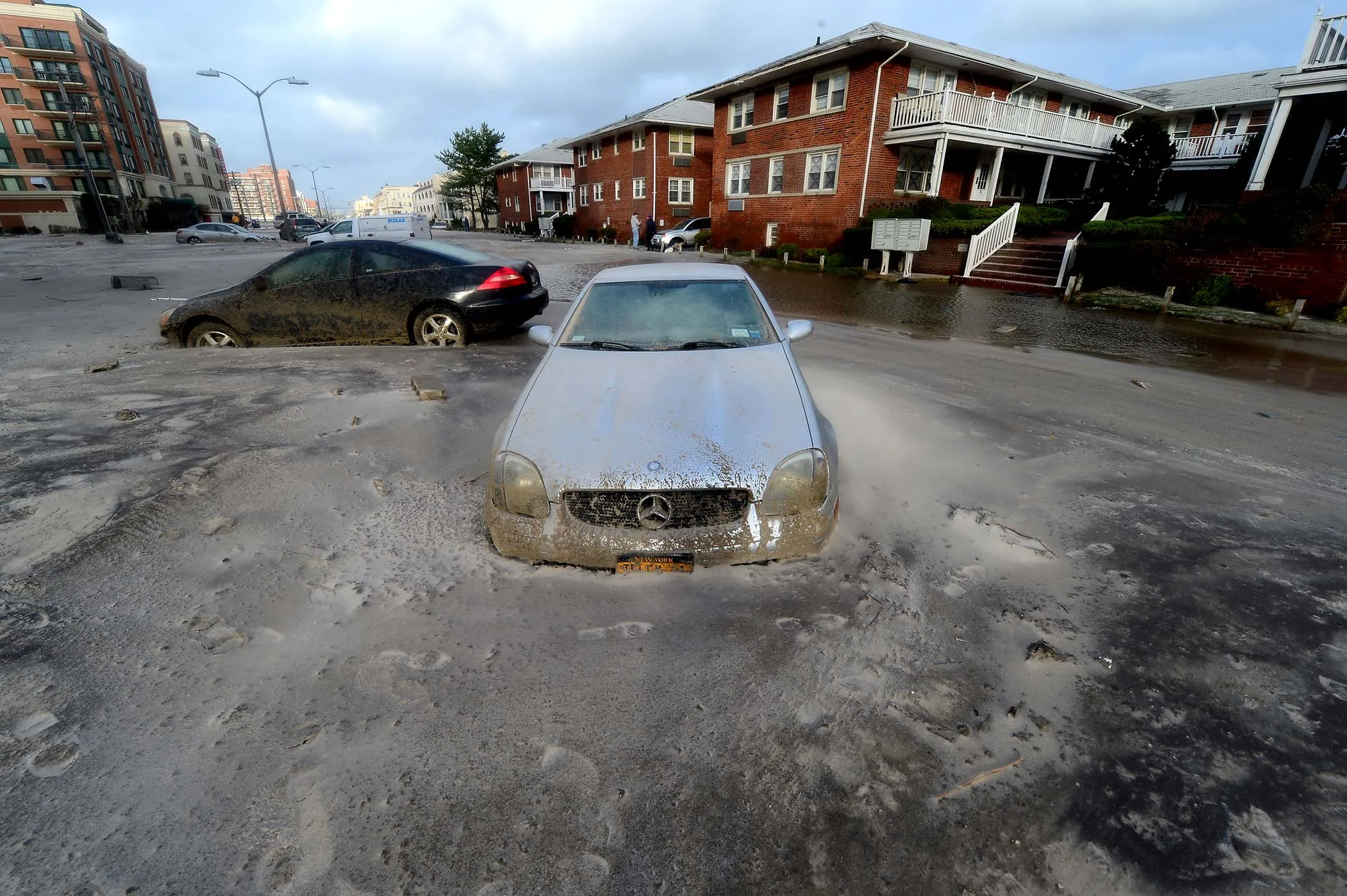 Two cars are abandoned in the sand from the aftermath of hurricane Sandy in Long Beach, New York. (Photo by Alejandra Villa/Newsday/MCT)