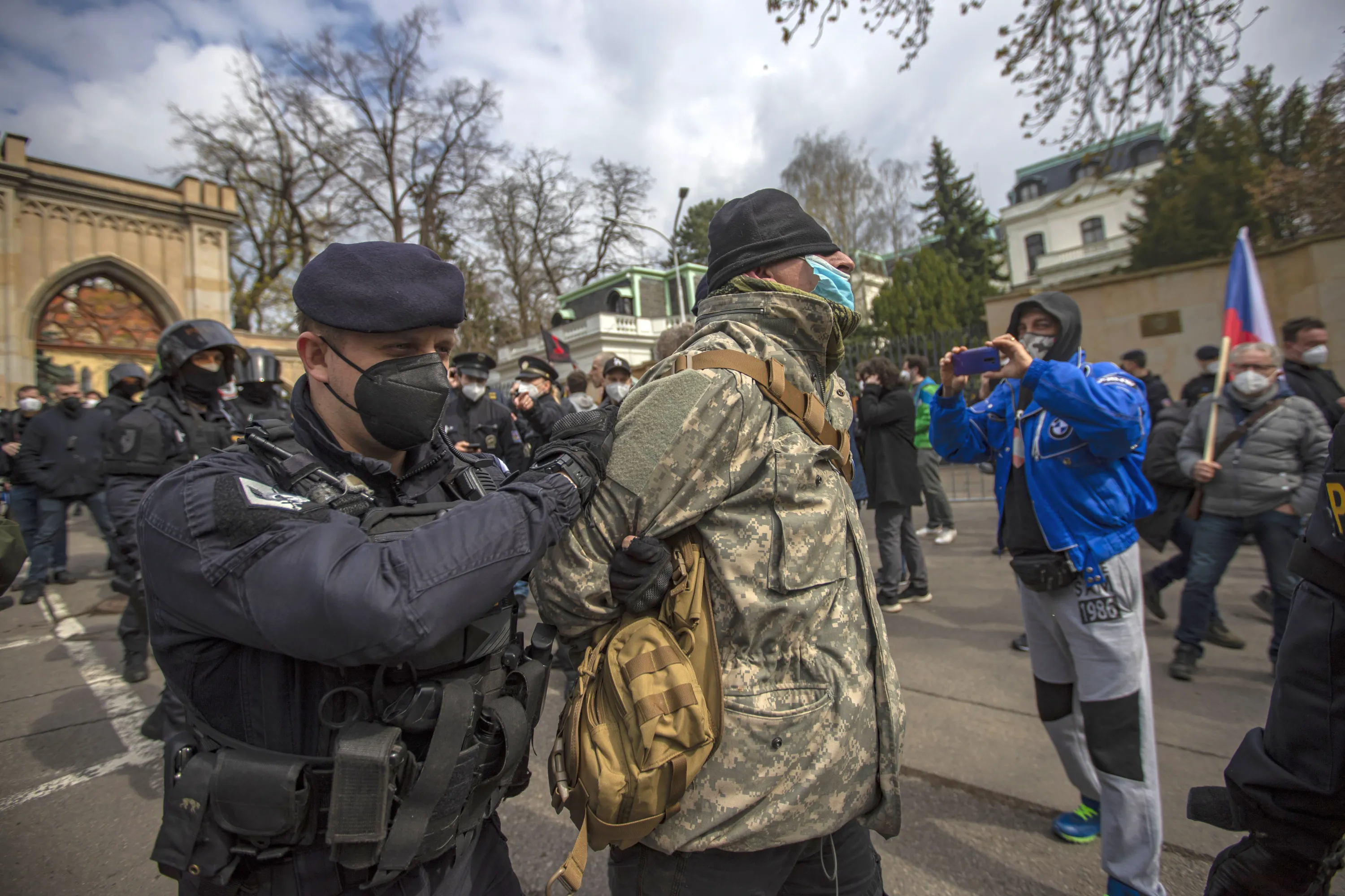 Riot police detains a counter-protestor as people gather to protest in front of Russian embassy in Prague, Czech Republic, 18 April 2021. The Czech Republic allege that members of the Russian intelligence services were involved in an ammunition depot explosion in Vrbetice in 2014, Prime Minister Andrej Babis said during a press conference on 17 April 2021. Acting Czech Foreign Minister Jan Hamacek said 18 diplomats would be expelled from the Russian embassy in Prague and ordered to leave within 48 hours, after they were identified as members of the Russian secret services GRU and SVR. (Photo by Martin Divisek/EPA/EFE)