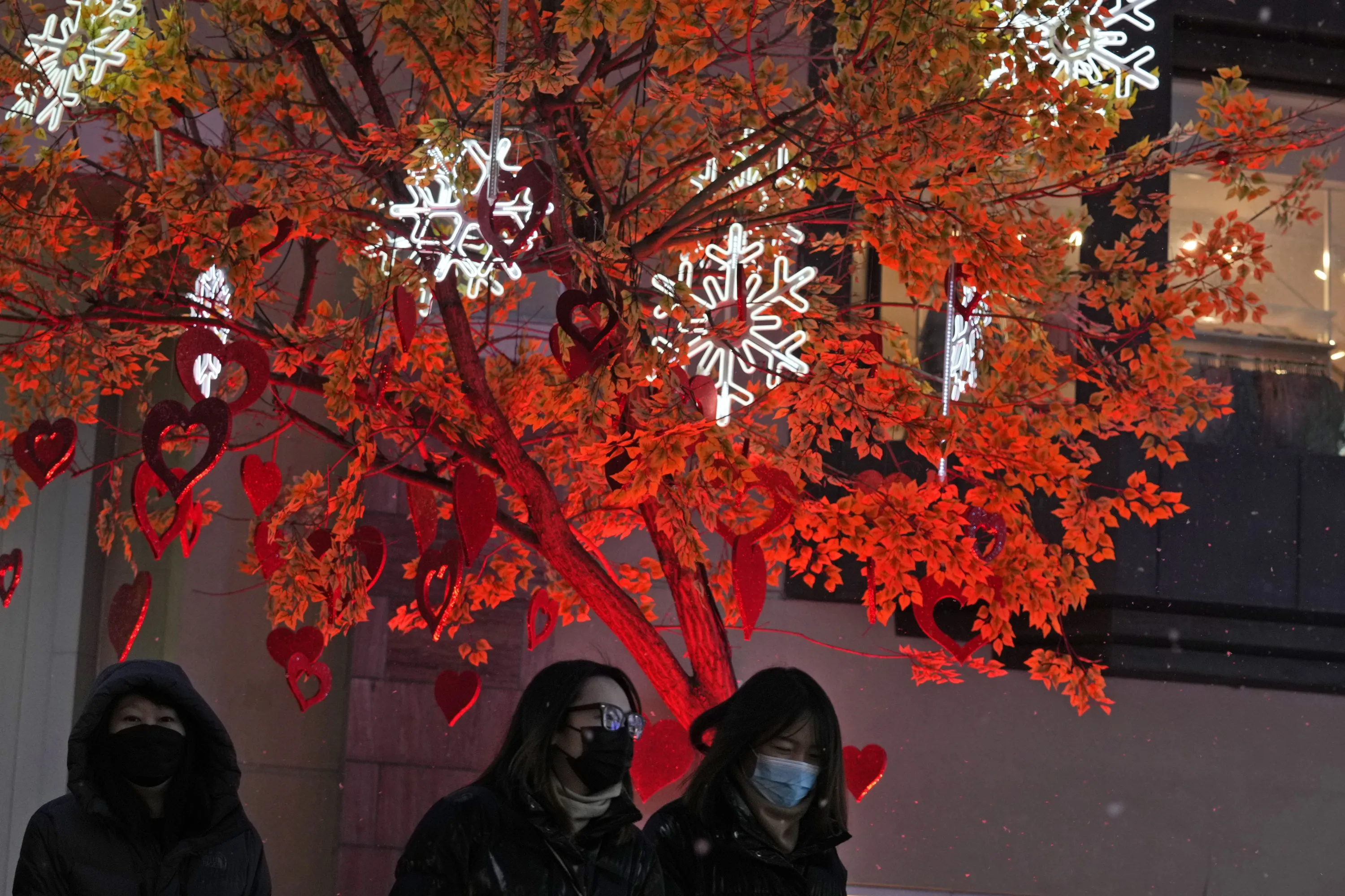Residents wearing masks to protect from the coronavirus walks near decorative lights on a tree in Beijing, China, Thursday, January 20, 2022. The sweeping “zero-tolerance” policies that China has employed to protect its people and economy from COVID-19 may, paradoxically, make it harder for the country to exit the pandemic. (Photo by Ng Han Guan/AP Photo)