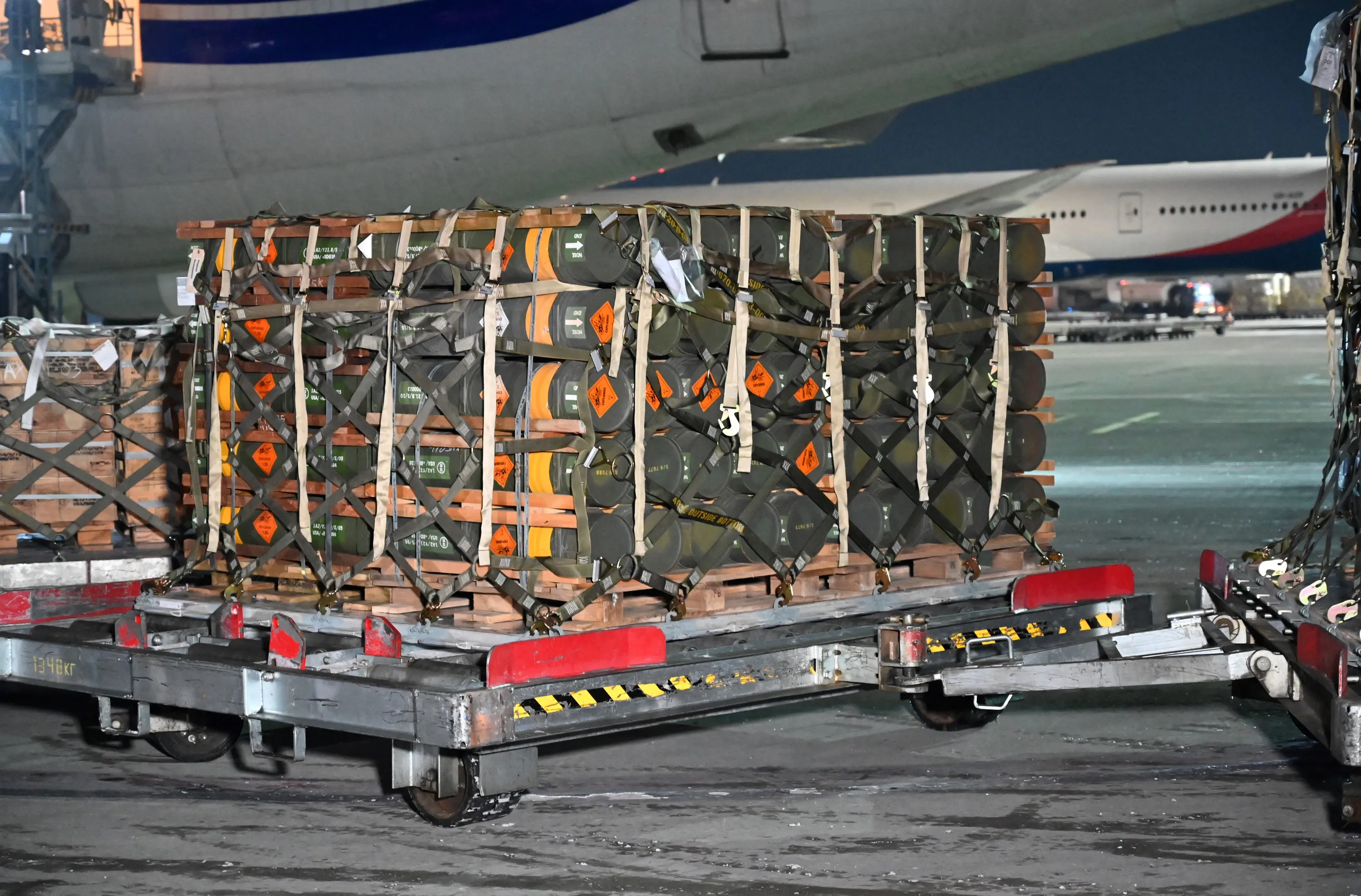 A picture taken on January 25, 2022 shows pallets of ammunition, weapons and other equipment while employees unload a plane with a new US security assistance provided to Ukraine at Kyiv's airport Boryspil. The US has stepped up security assistance to Ukraine, amid fear of Russian invasion with Russia's build-up of tens of thousands of troops on Ukraine's border. (Photo by Sergei Supinsky/AFP Photo)