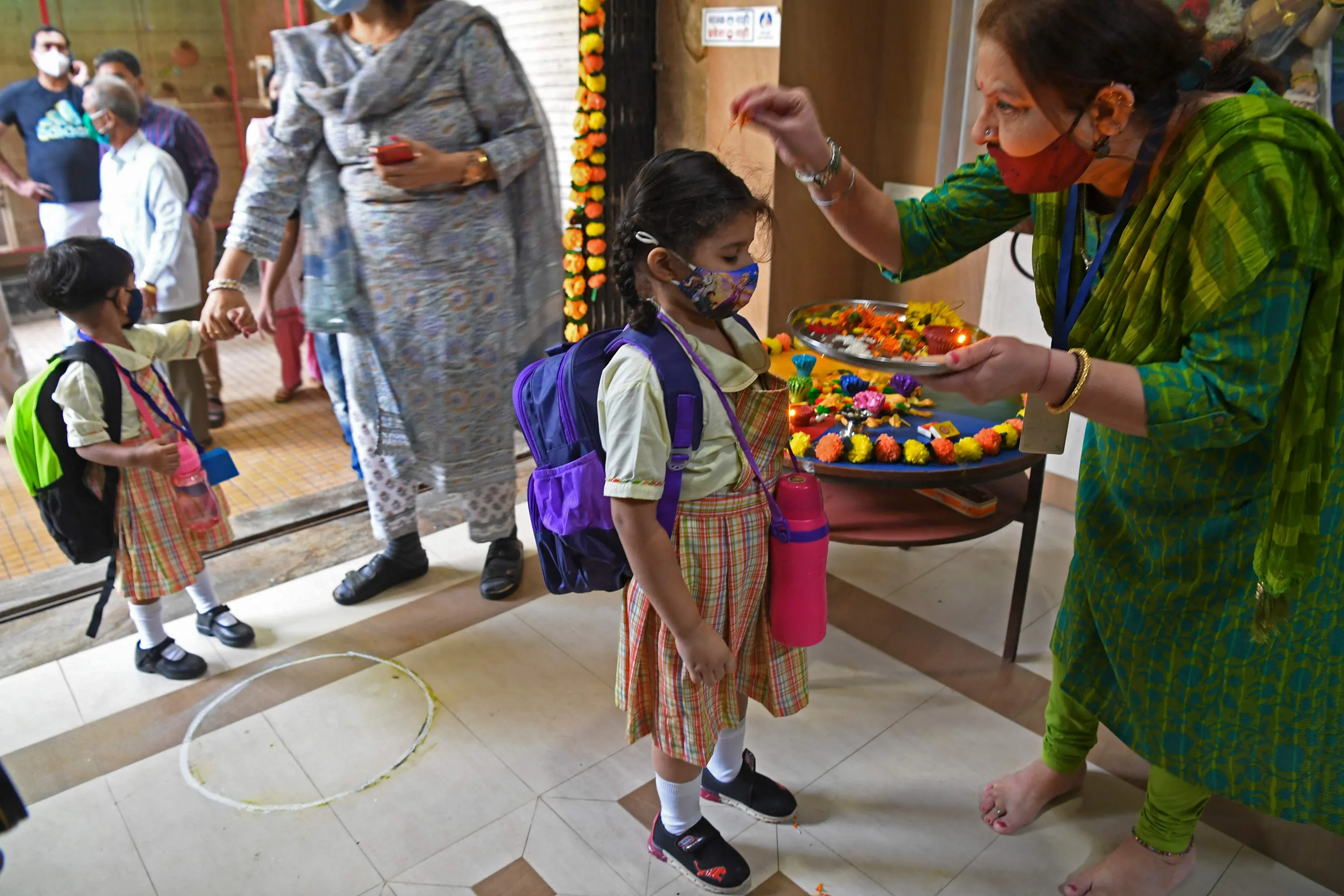 A teacher traditionally welcomes a student upon her arrival at a school in Mumbai on January 24, 2022, after schools were reopened that were closed as a preventive measure to curb the spread of the Covid-19 coronavirus. (Photo by Indranil Mukherjee/AFP Photo)