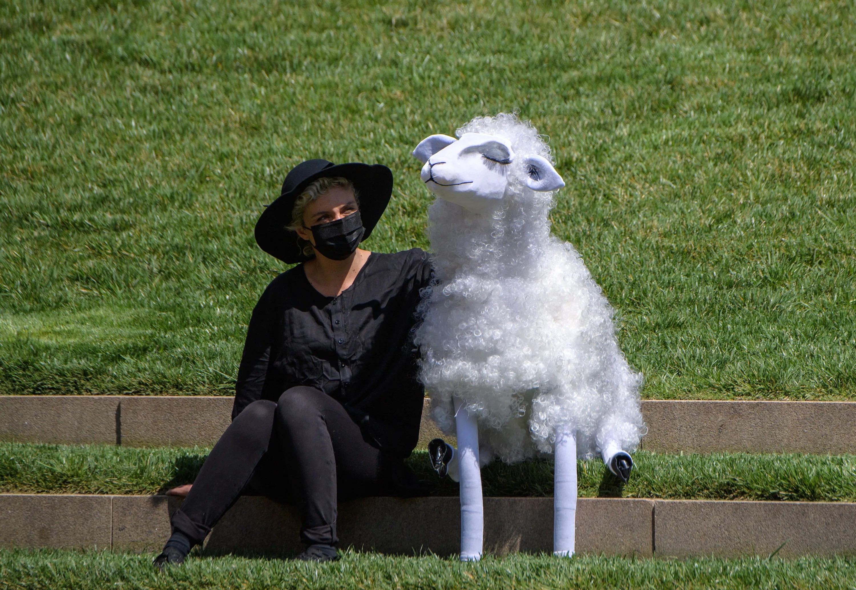 A Basil Twist's puppeteer sits with a sheep puppet prior to a New York Philharmonic performance at Hearst Plaza at Lincoln Center as part of Lincoln Center as part of Lincoln Center's Restart Stages on April 7, 2021 in New York City. The musicians performed for an audience of 150 healthcare workers on World Health Day, after being shut down due to the pandemic last March. (Photo by Angela Weiss/AFP Photo)