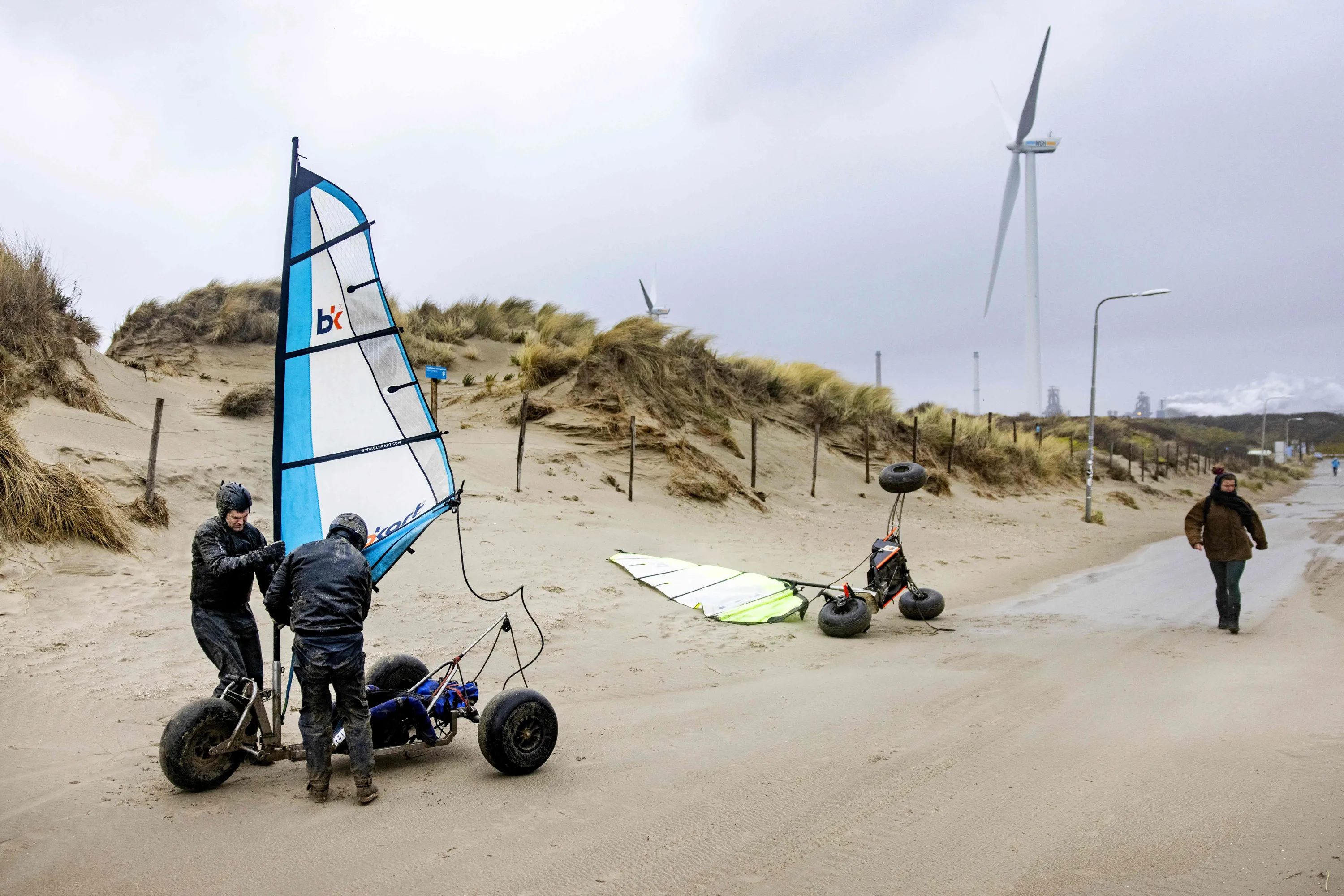 A woman walks as storm Corrie rages over the beach of Wijk aan Zee, on January 31, 2022. The KNMI has declared code orange in North Holland, Friesland and the Wadden area and code yellow for the rest of the Netherlands and traffic and outdoor activities can be affected by heavy gusts of wind. (Photo by Ramon van Flymen/ANP via AFP Photo)