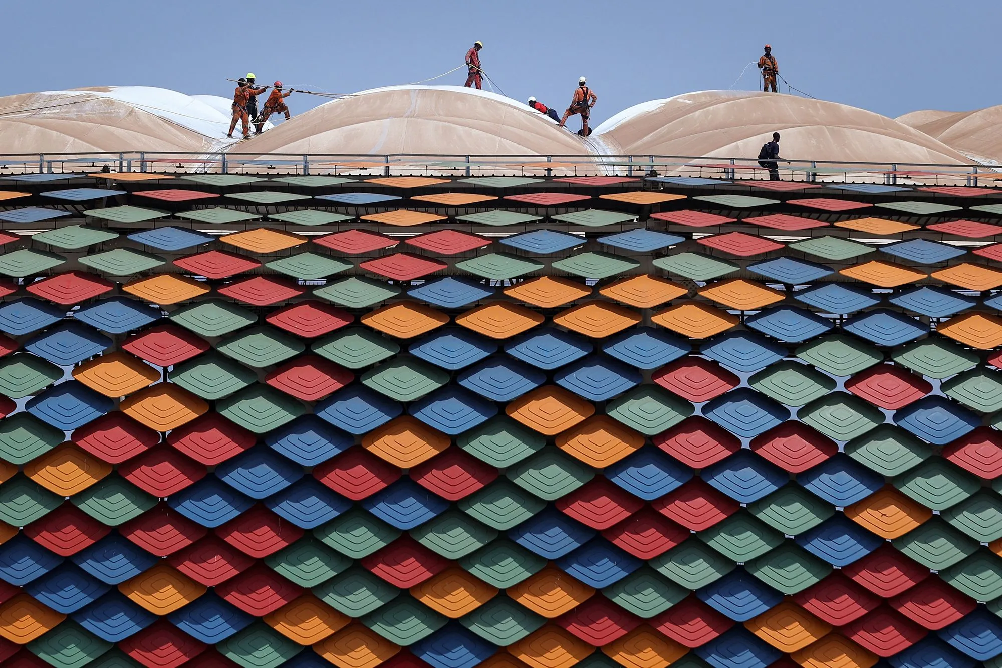 Workers prepare the Olembe stadium in Yaounde, Cameroon on January 7, 2022 two days before the start of The African Cup of Nations (CAN). (Photo by Kenzo Tribouillard/AFP Photo)