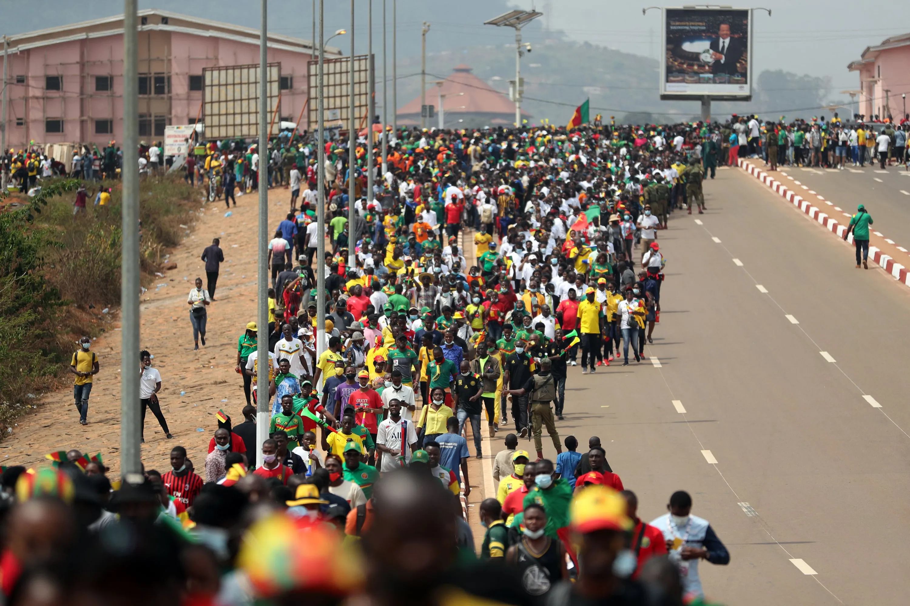 Cameroon fans outside the Olembe stadium before the first match of the Africa Cup of Nations football tournament in Yaoundé, Cameroon on January 9, 2022. Cameroon is hosting the competition and will play Burkina Faso in the opening match. (Photo by Mohamed Abd El Ghany/Reuters)