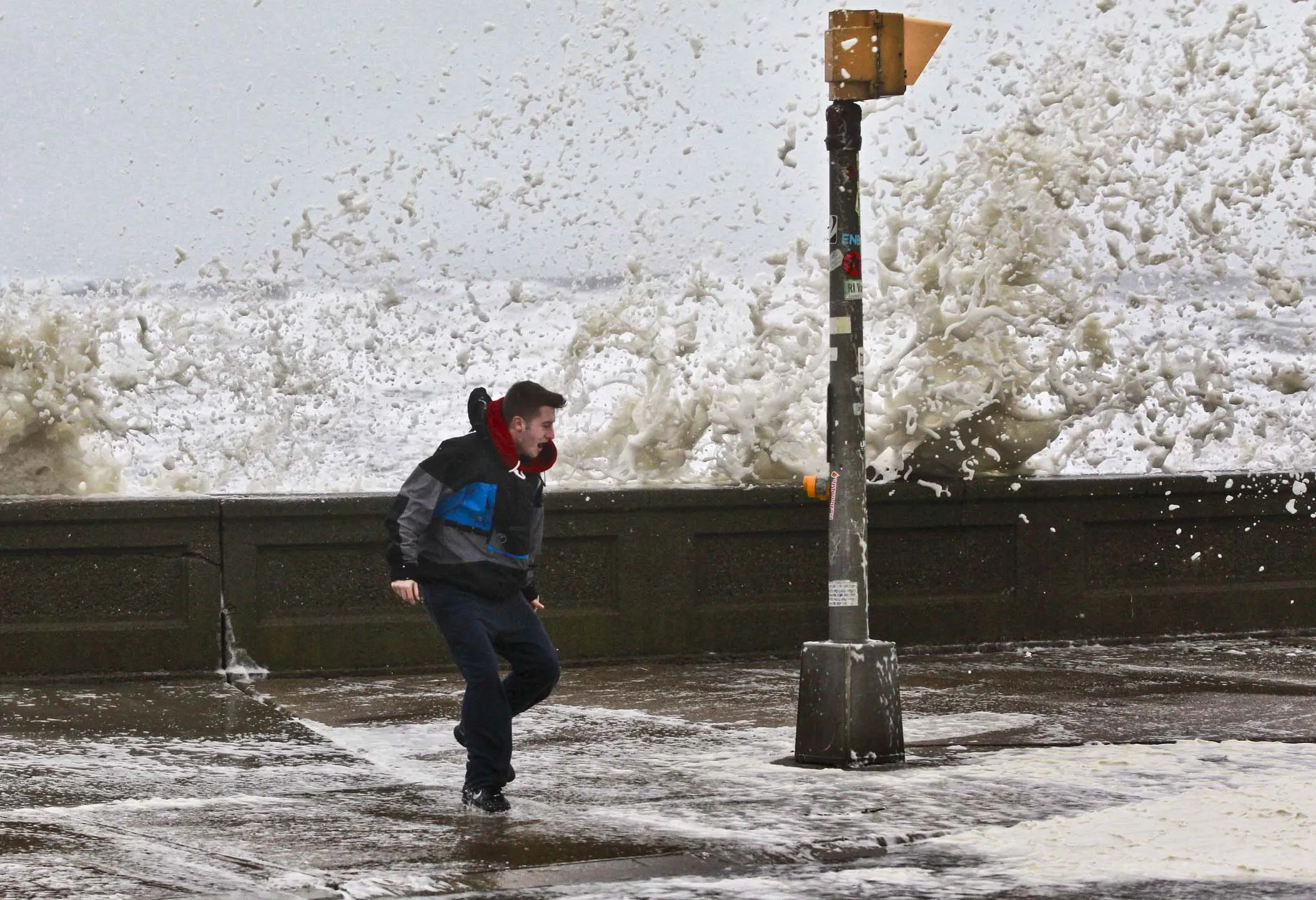 A man reacts to waves crashing over a seawall in Narragansett, Rhode Island. (Photo by Steven Senne/Associated Press)